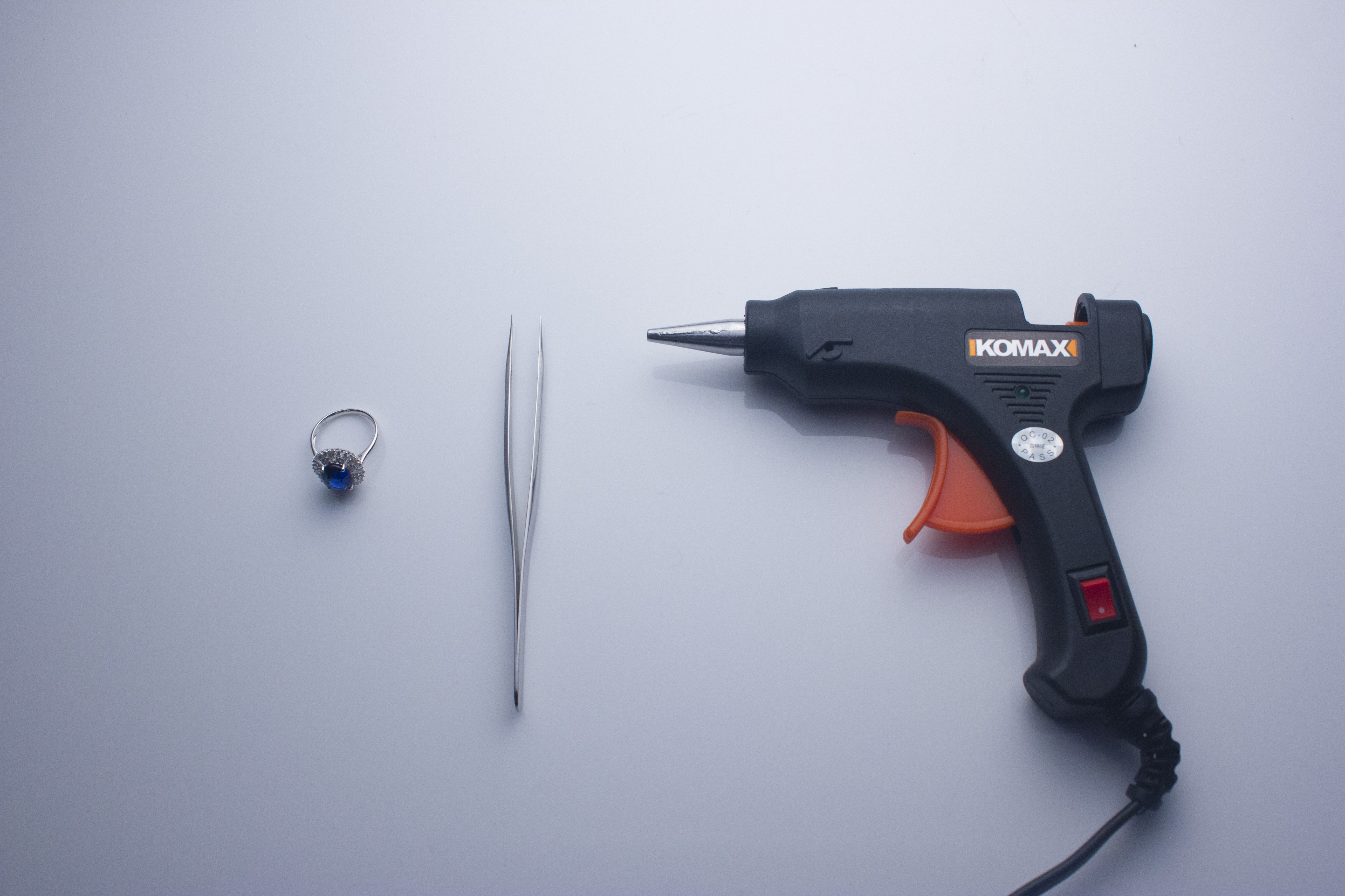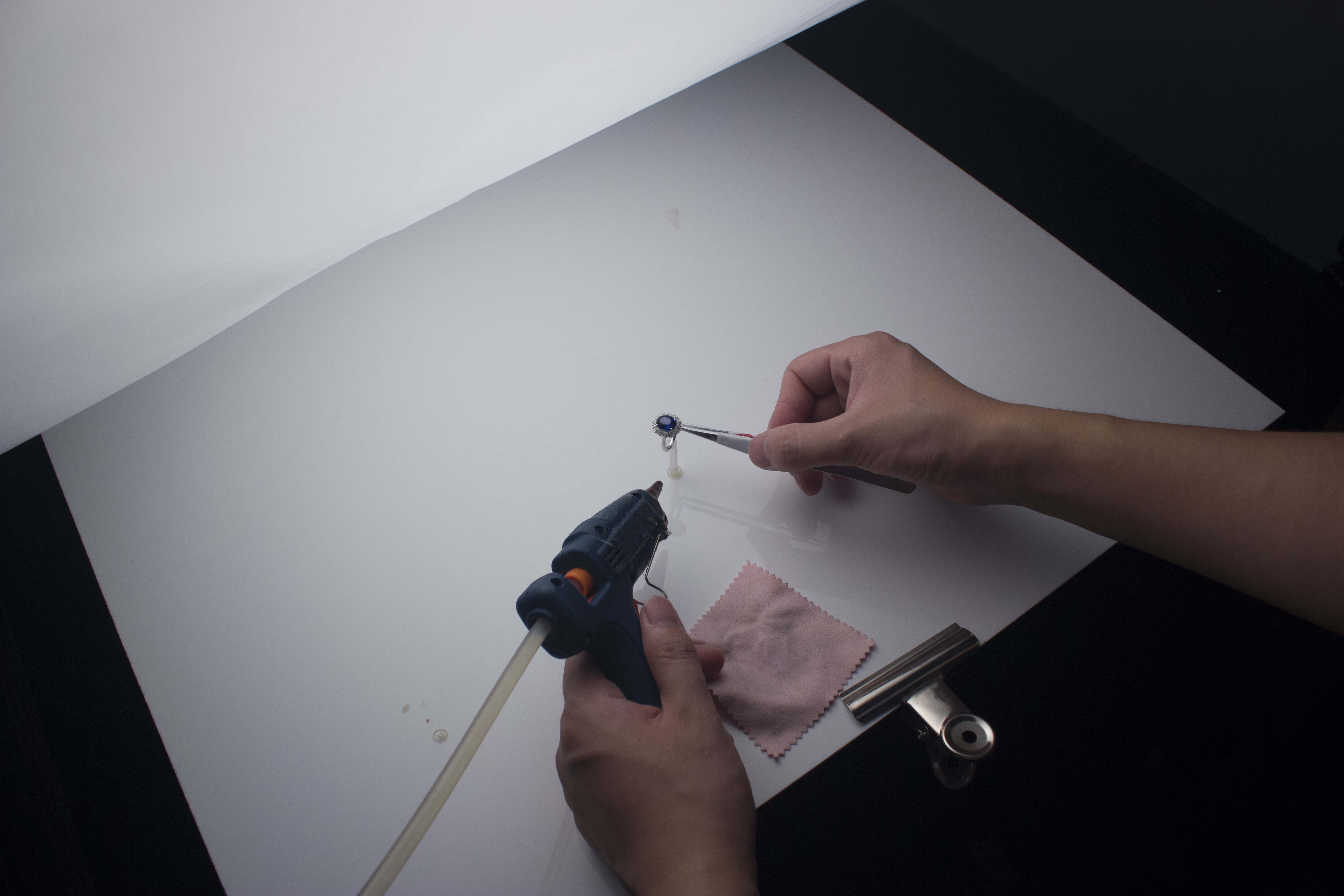 拍摄之前我们需要准备一些拍摄道具,镊子与胶枪,一个是移动产品用途一个是固定产品用途。市面上大部分公司选择使用蓝丁胶作为固定珠宝产品,好处是操作方便,但是缺点也是显而易见,不够稳定,遮挡产品结构,颜色投影在产品上;为了解决这个问题我选择用热熔胶枪,缺点是操作麻烦,优点不言而喻。