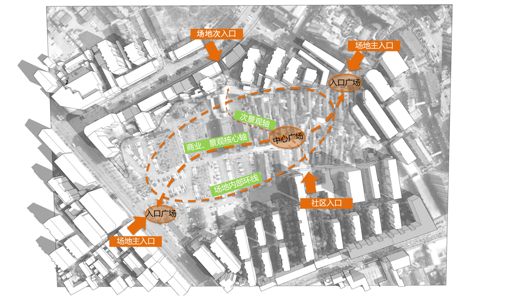 然而摆在我们面前的还有一个问题,项目用地几乎四面都被居民楼包围,面对如此内向型的地块,我们要如何吸引人流呢?