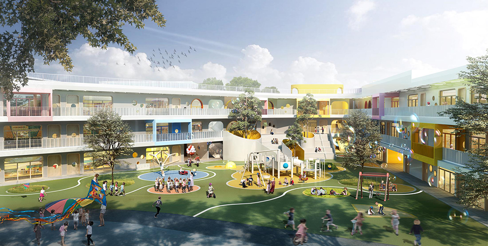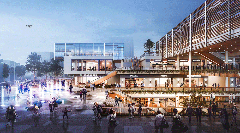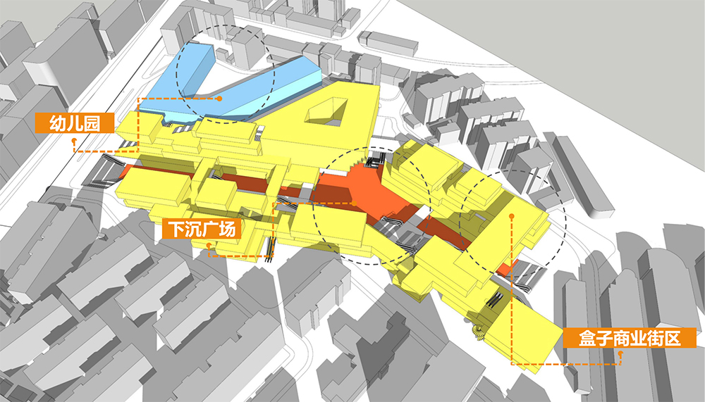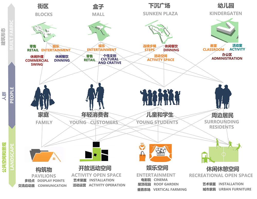 在项目整体的建筑形态上,我们将塑造街区、盒子、下沉广场、幼儿园等多元化、多层次的空间形态,公共空间和景观融合担当多经点、交流启动器的构筑物;承载艺术装置、活动运营的开放活动空间;囊括电影院、屋顶花园、垂直农场等的娱乐空间以及休闲休憩空间,构筑一方满足全客群体验消费、休闲生活、文艺感与市井气兼具的全生活中心。