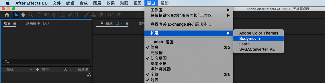 插件安装成功后,可在AE的 菜单 > 窗口 > 扩展 中找到 Bodymovin,如下图: