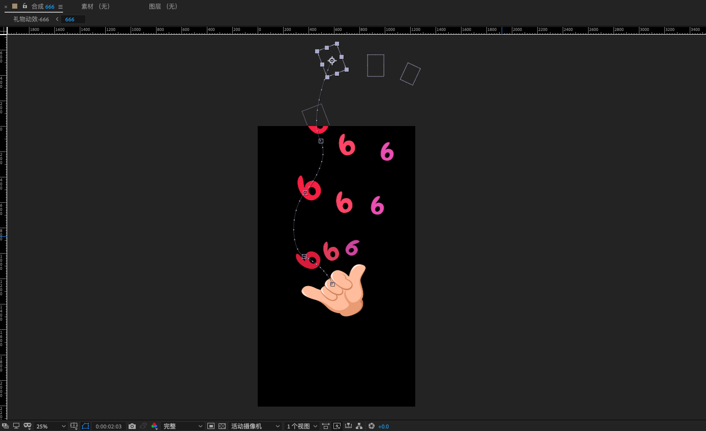该项目工期非常紧,所以制作该礼物效果时,没有过多的花里胡哨的想法,仅按照常规的手势6,加上部分数字6的装饰摆动。主要使用的是AE内的基础动效:位置、缩放、旋转、不透明度,以及星点装饰的阴影、发光等效果。