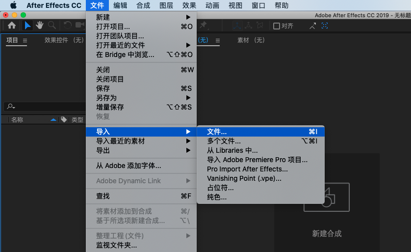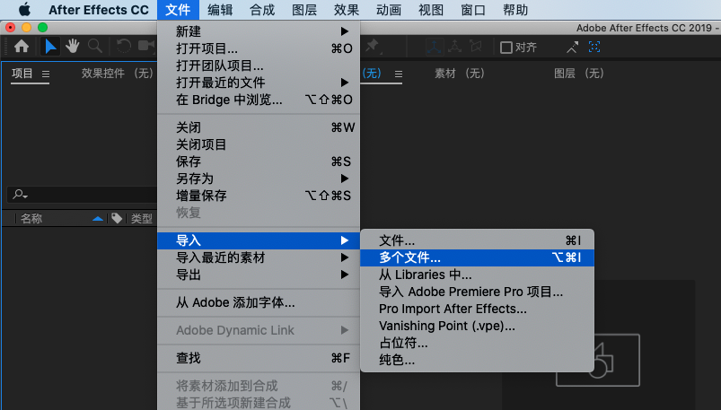 打开AE 选择:文件 > 导入 > 多个文件 ,如下图: