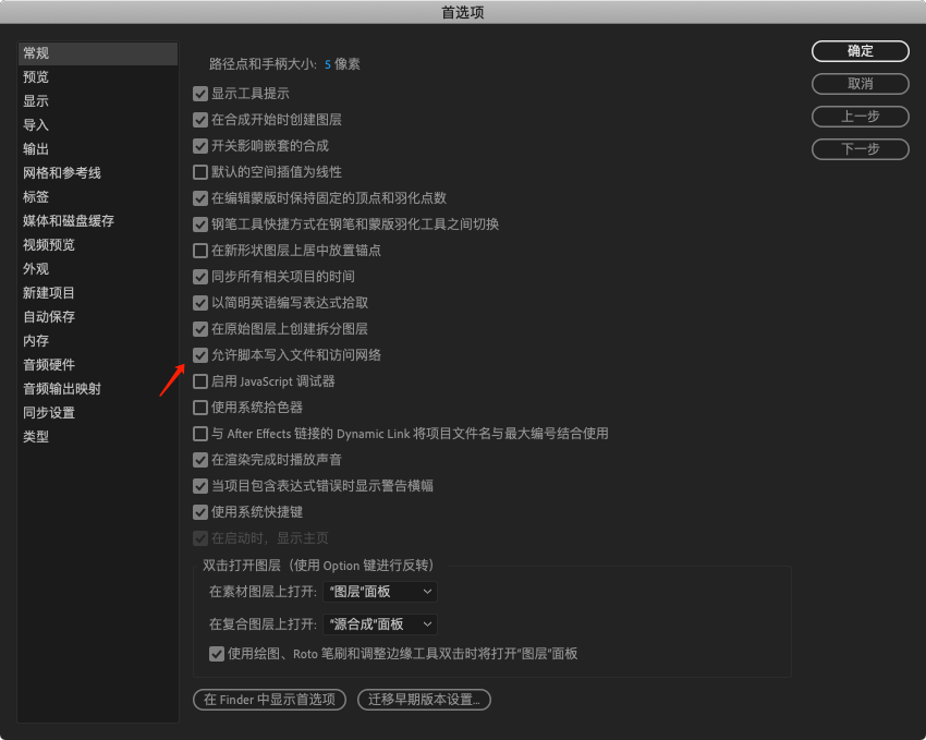 -注意:安装成功后,需要打开AE,点击 After Effects CC > 首选项 > 常规 ,找到并勾选 “允许脚本写入文件和访问网络”,然后再确定。如下图所示: