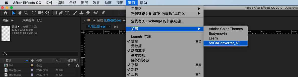 插件安装成功后,可在AE的 菜单 > 窗口 > 扩展 中找到 SVGAConverter,如下图: