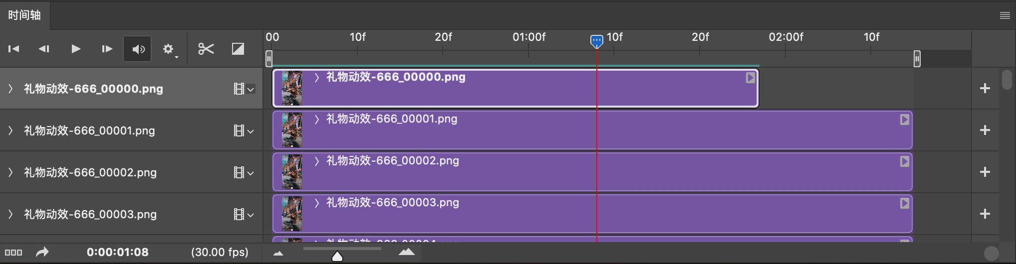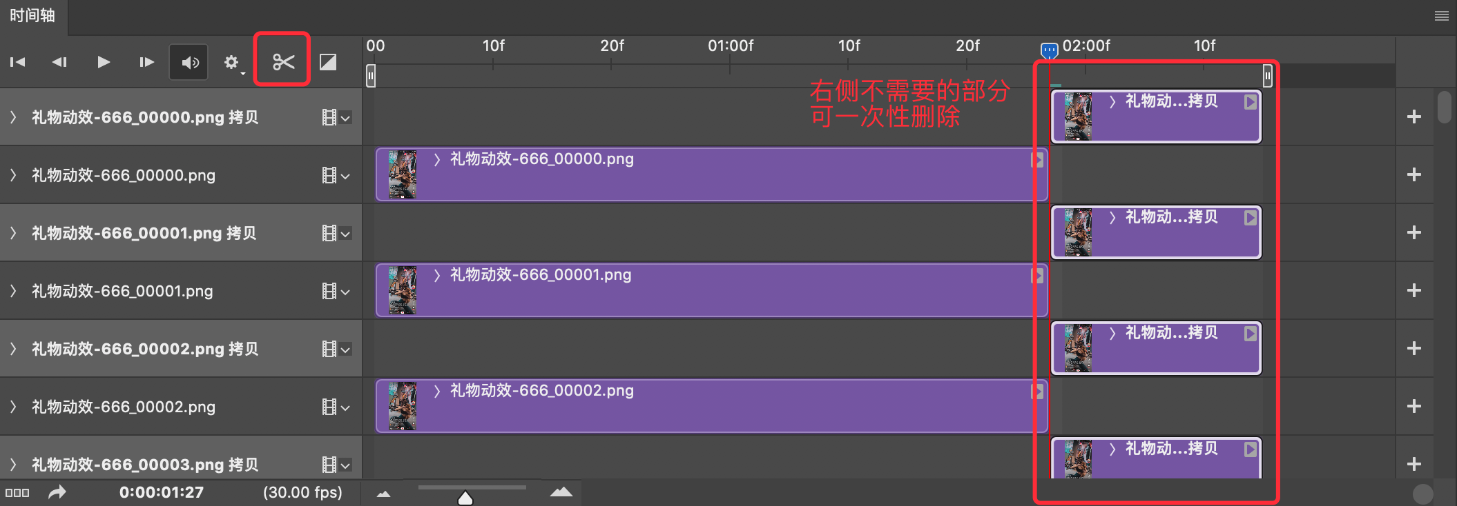 方法一:逐个拖动每张PNG右侧时间轴,将其缩短到适当的时长位置,如下图所示: