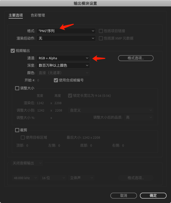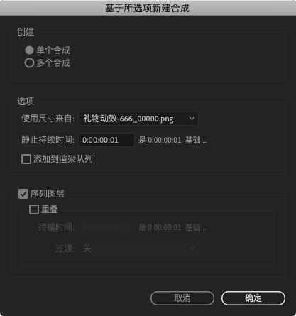 -注意事项 02:创建 单个合成,一定要勾选 序列图层,去掉 重叠(因为我们输出的PNG是透底的)。
