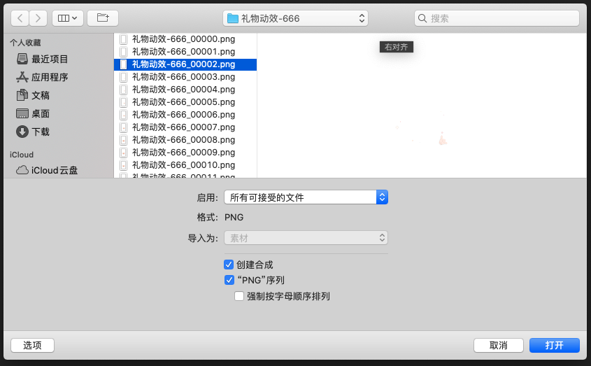 选择第一步中PNG序列的文件夹,点击任一张PNG文件,下方默认勾选了一些选项,起初我并未在意,并且同时勾选了顺序排列,其实不勾选也没啥影响,毕竟文件夹内已经排序好了,并且AE很机智的能够识别出来这就是一个PNG序列帧,如图所示:
