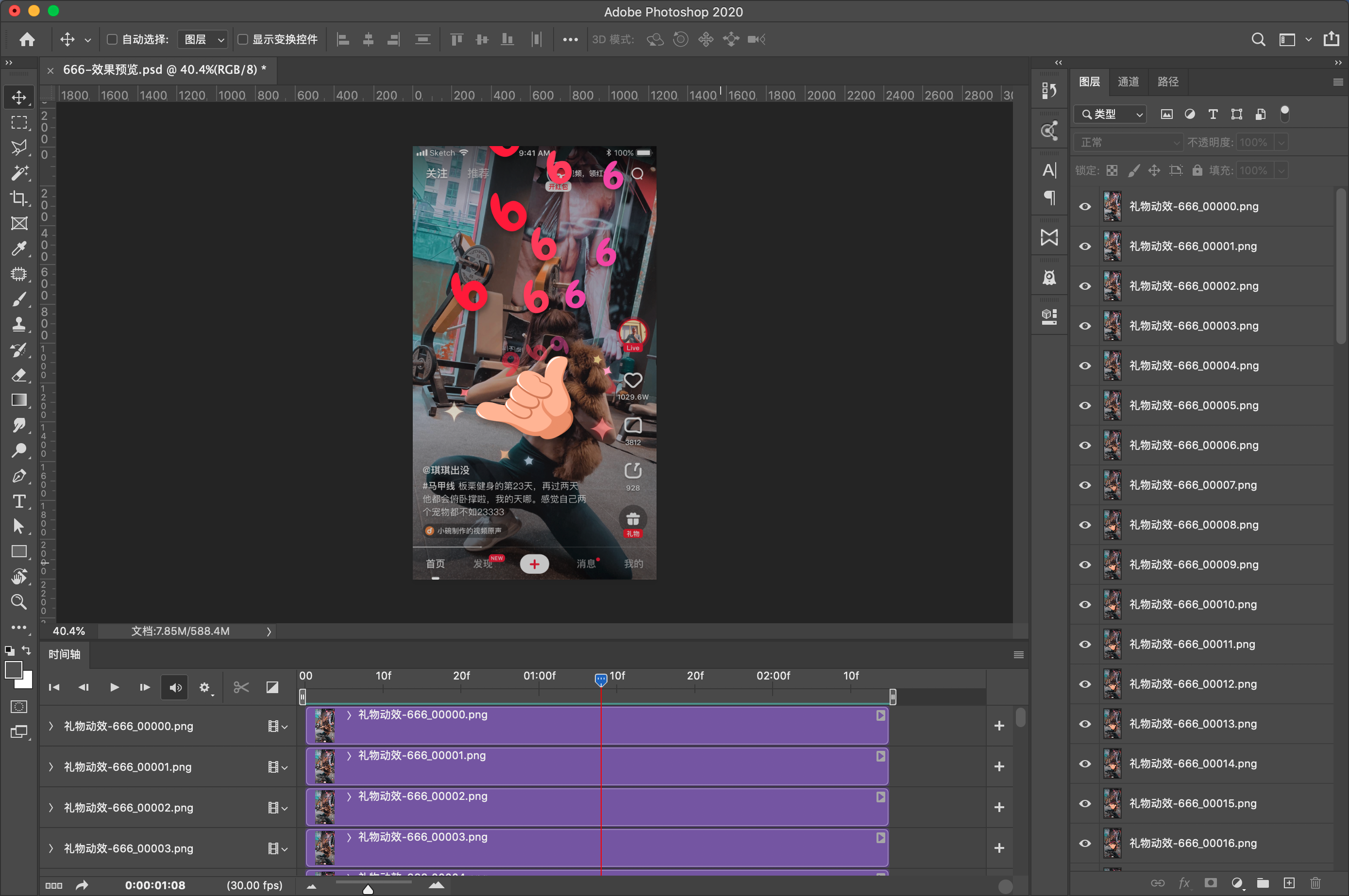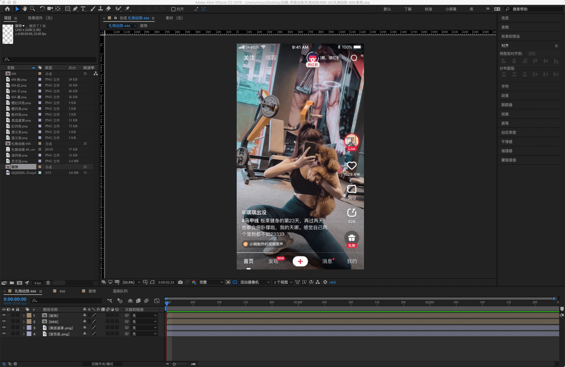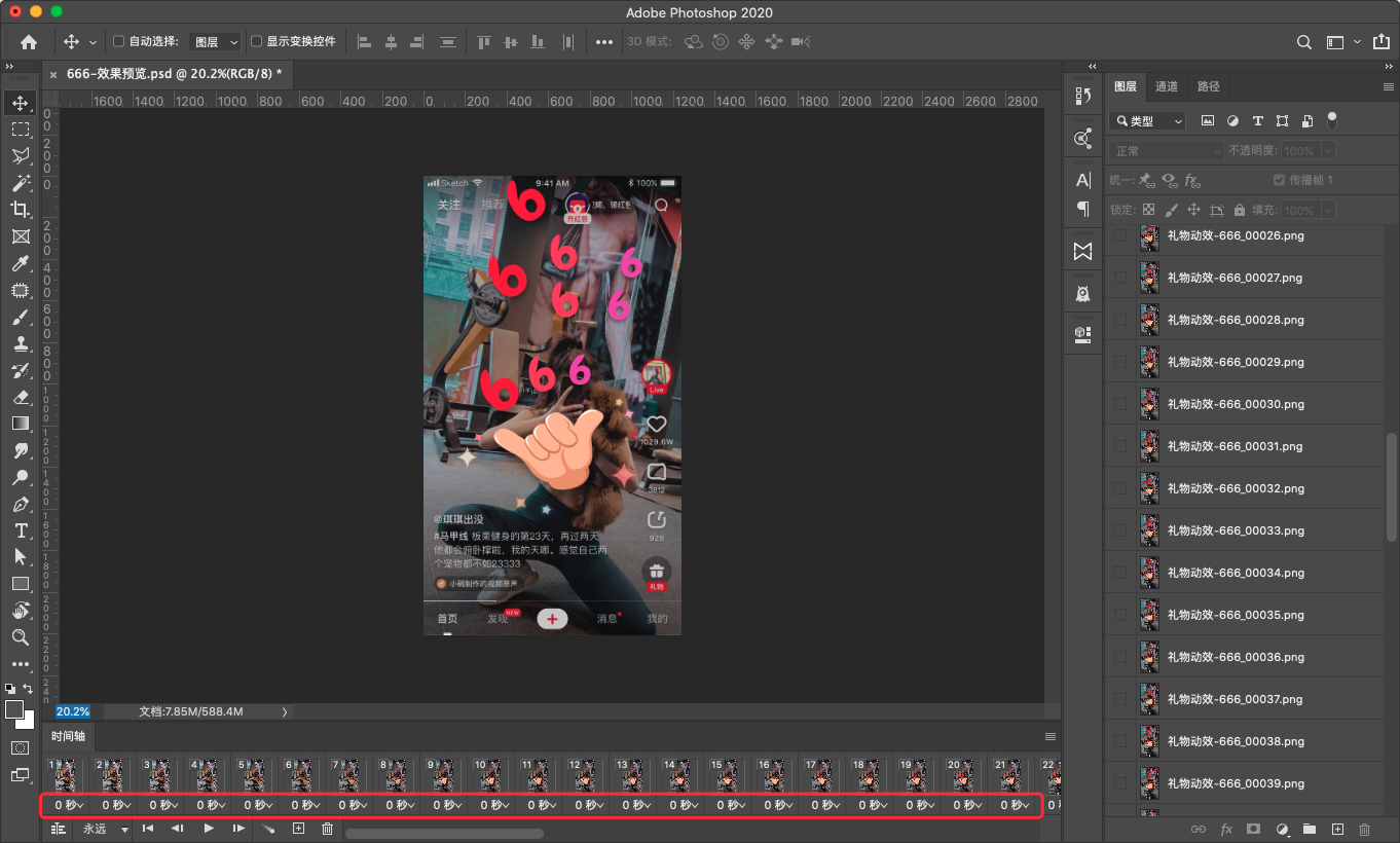 该部分内容主要以【畅刷短视频APP】的礼物动效:666 为例。从素材输出、动效制作、SVGA文件输出三个方面进行阐述,其中因为大家的设计需求不同,动效的细节制作不具有太多参考价值,故而仅提出需要注意的地方。