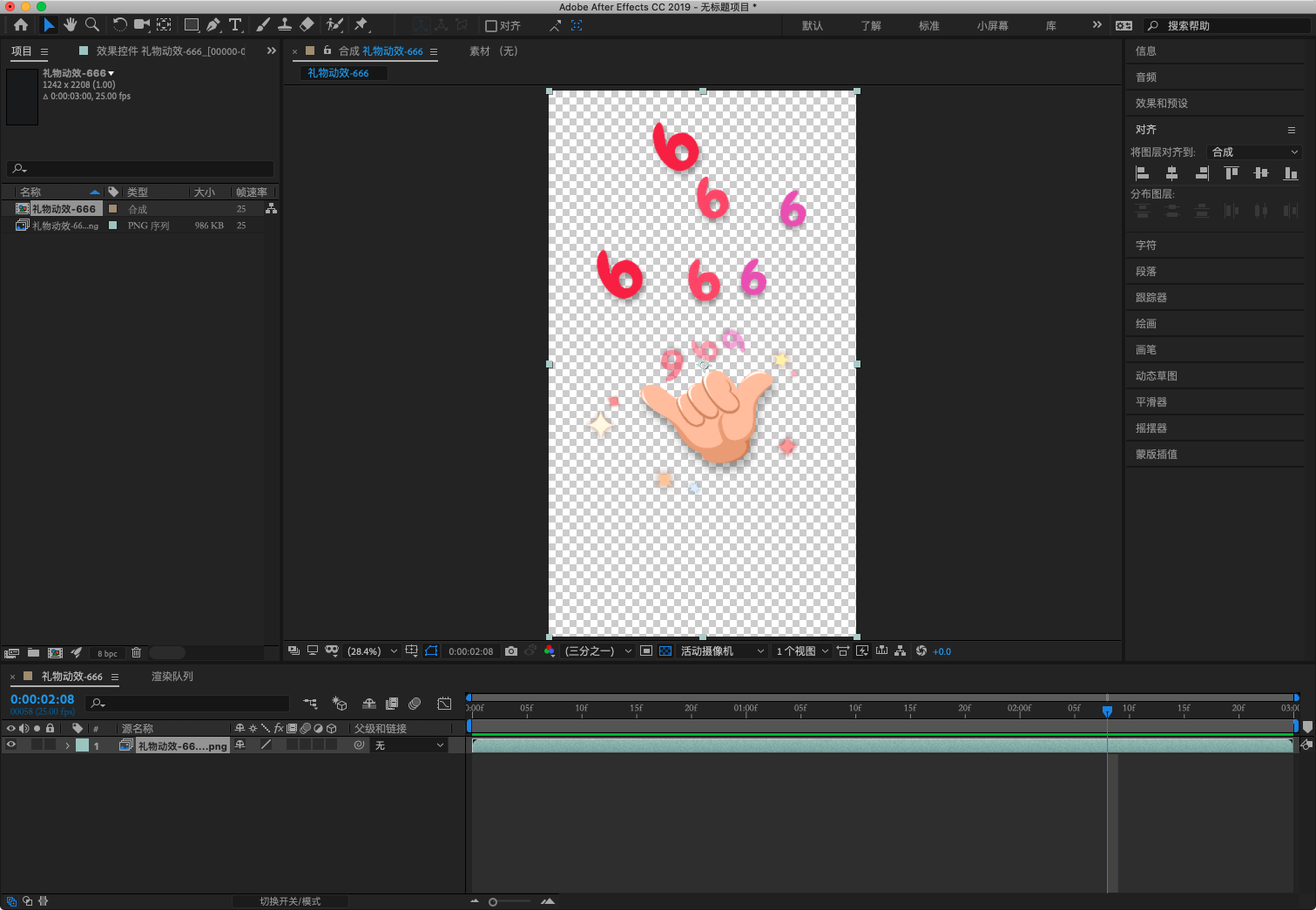 为兼顾各类人员的需求,文中案例 礼物动效-666 共输出了四类文件。其中GIF、PNG序列的制作都比较简单,GIF需要透底的,所以未使用AE插件,通过PS导入PNG序列进行转换。