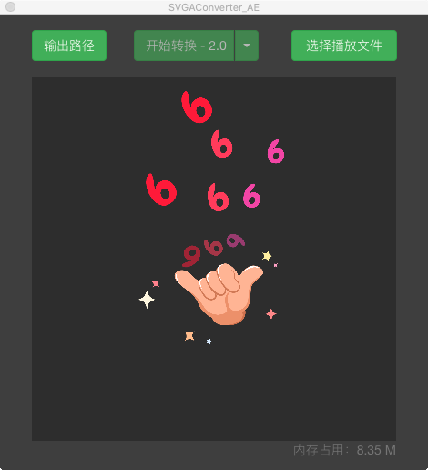 一般来说,完成以上操作该SVGA动效就输出完毕。但是我们在预览时发现(可能读者难以发现...)上文案例中输出的SVGA文件并没有星点的发光效果,手势6与数字6的阴影也没展示。当我们查看短视频时,因背景是不断变化且不可控的,增加一定的投影有利于突出上方动效的层次。