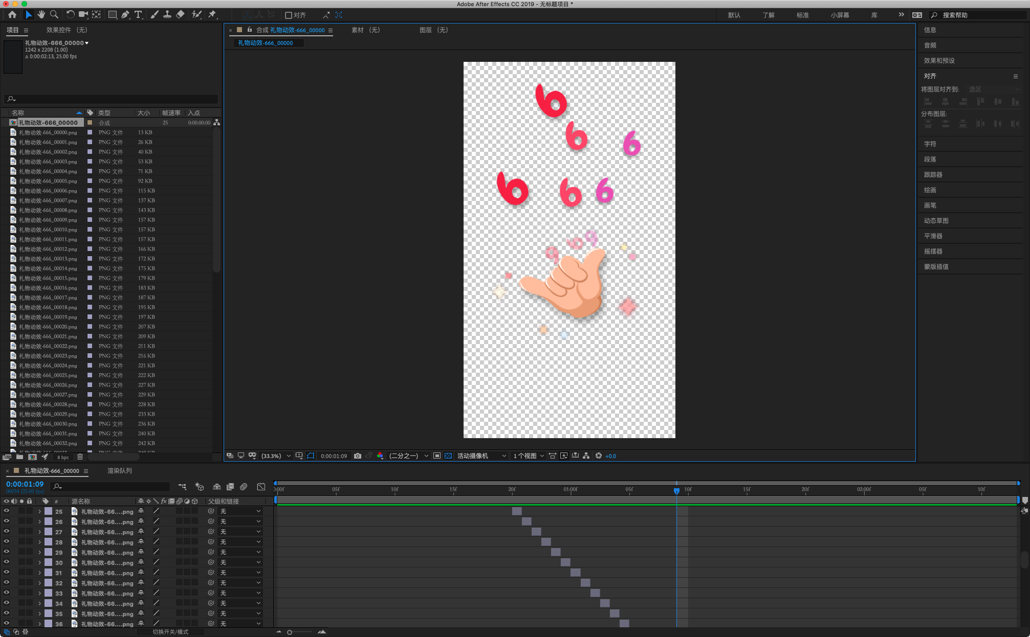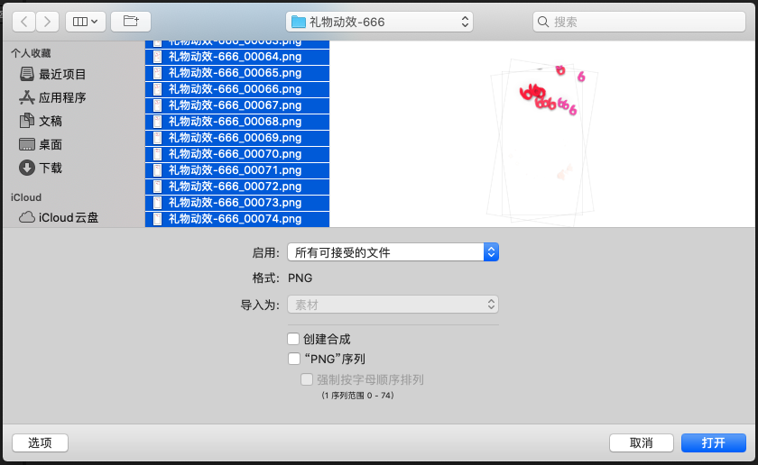 本文中的案例:礼物动效-666,我导出的序列共有75张图,每秒25帧的话,整个动效至少有3s,但在AE中制作的动效时长仅2秒15帧左右,也就是每秒30帧。缩短1/3的话显然会严重影响动效流畅性,不足以表现效果图。退而求其次,每6帧删1帧,也就是我删掉了6的倍数帧(6.12.18....依次类推至第72帧)