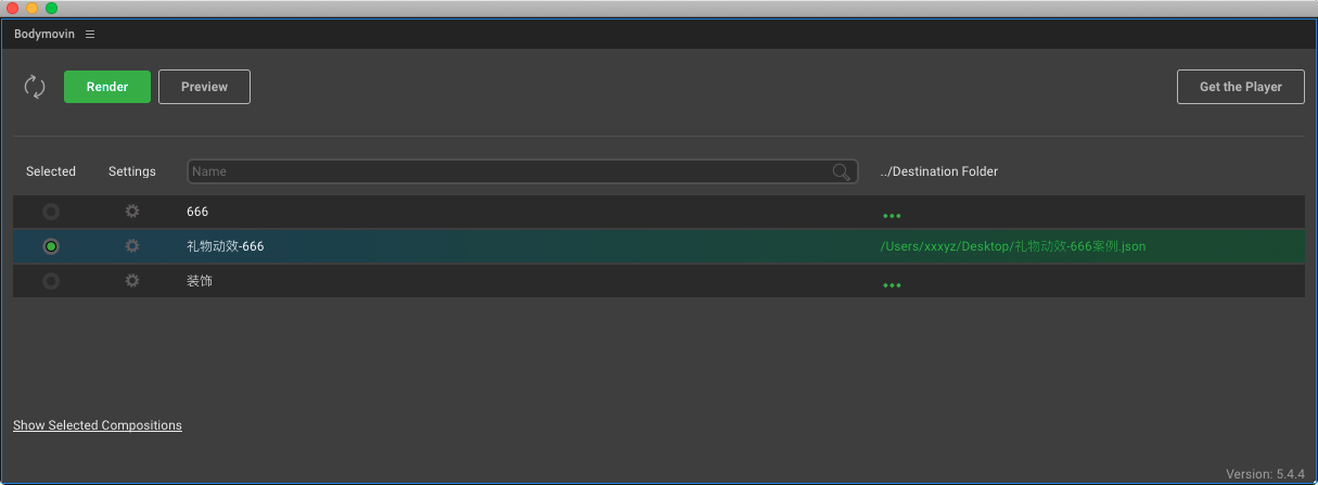 窗口默认会展示该文件下的所有预合成(左下角的文本按钮可切换,只展示选择的合成),选择我们需要导出的合成,设置存储位置,如图是我已设置完毕的: