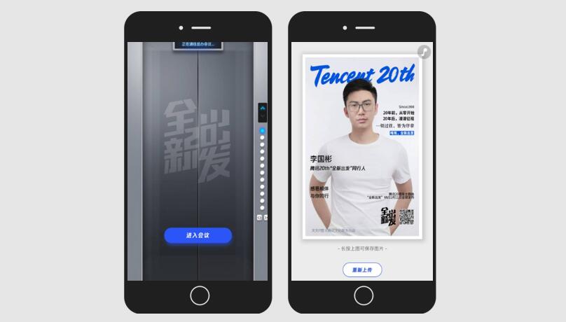 H5介绍:腾讯20周年庆针对腾讯员工的宣传H5,很高兴以腾讯人的身份体验了这支H5。首先是一段视频,腾讯的老大们在办公室等待你的到来,各自阐述了对腾讯人的理解,而后邀请你拍个照,点击拍照图标,有男女性别的选择,上传照片后,男女分别有三个形象选择,最后合成一张海报。