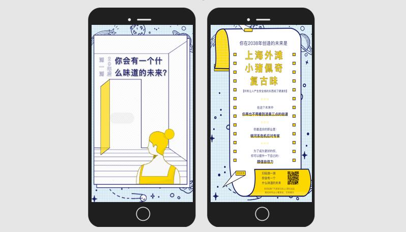 H5介绍:开始的人物选择进入时光号,中间穿插问答题的互动形式,最后生成海报。