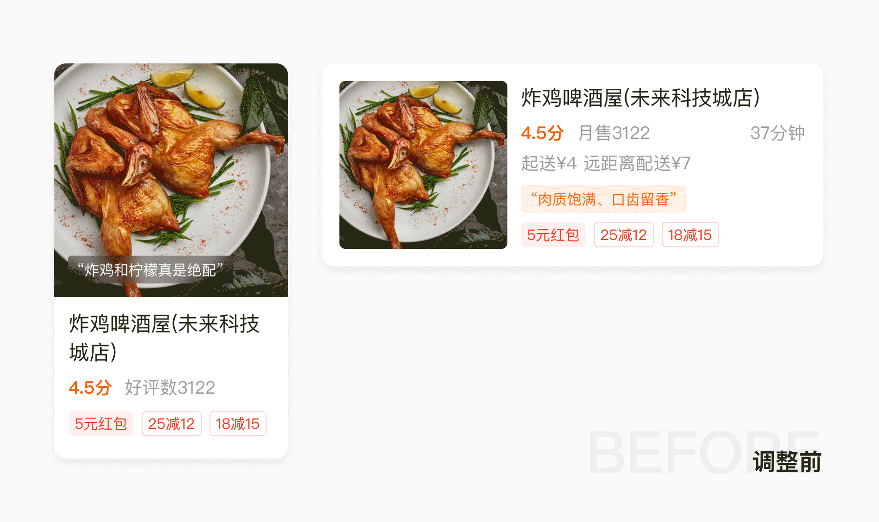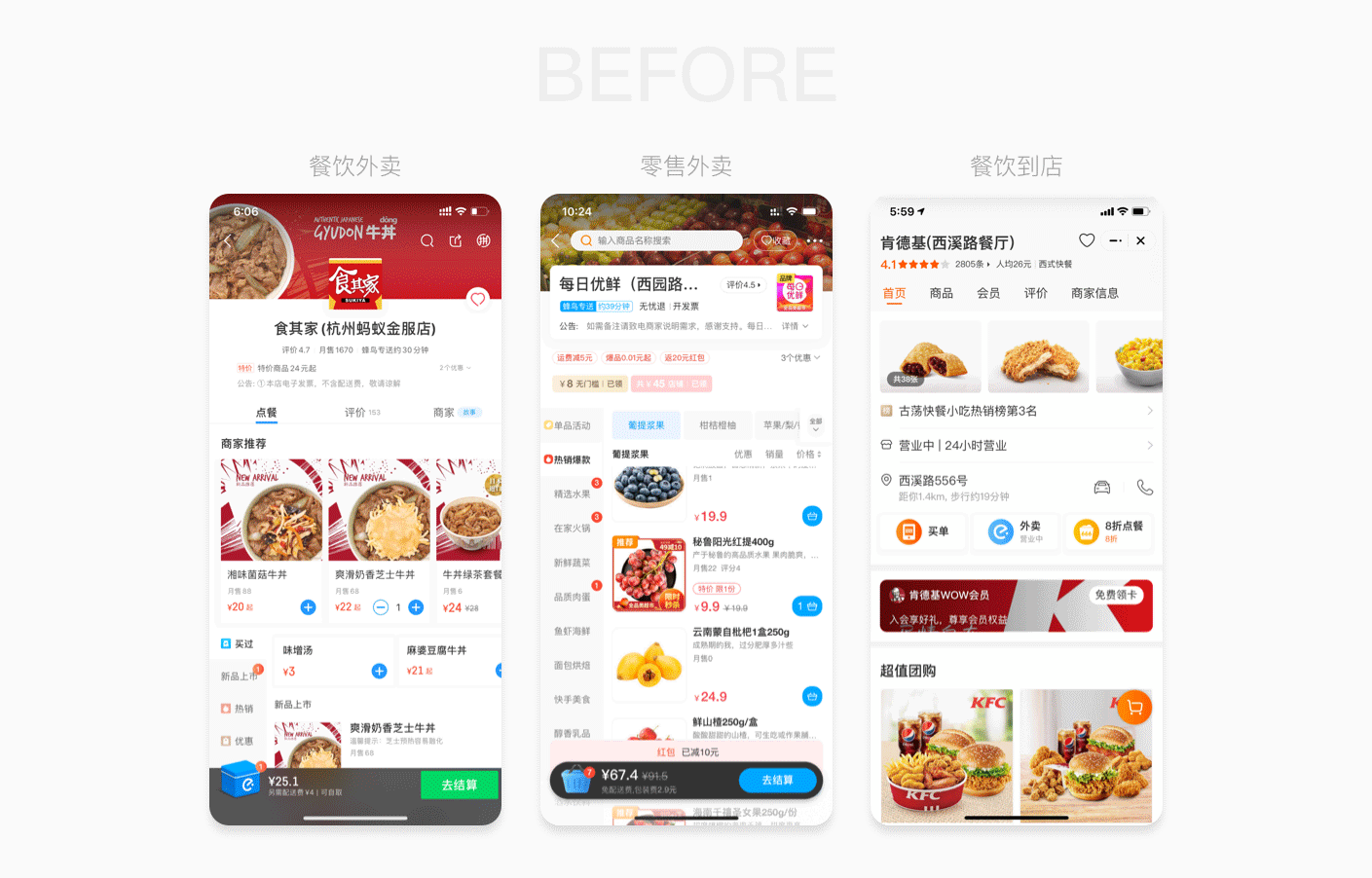 在本地生活店铺体验上,我们将原本团购、外卖的两套设计框架不统一的体验,升级为框架统一的服务体验,弱化用户理解成本,通过颜色、服务信息建立到店、到家心智。