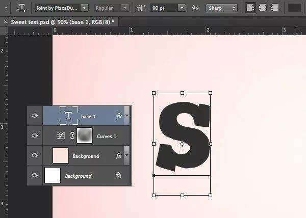 现在创建一个新组,并将该组命名为“S”。将分别创建文本。首先从“S”文本开始。添加文本,选择了set-by-pizzadude字体设置90px字体大小,将此文本图层命名为“base 1”