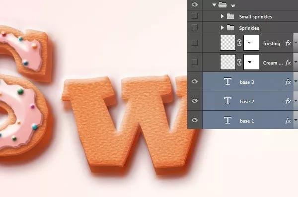 打开“W”文件夹,首先删除“Cream S”图层,然后关闭除3个基本图层以外的所有图层,然后键入文本“w”。