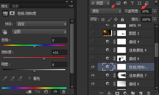 整体看起来还不够通透,有点偏暗!我们新建一层色相饱和度调整图层!将饱和度提高到31,然后将图层模式改为滤色!不透明度改为10%!