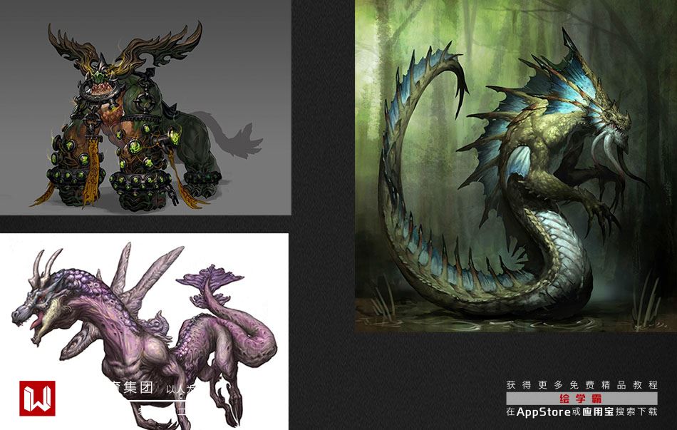 怪物设计元素运用是千变万化,如画一个自然系的怪物会用到花花草草,森林等元素,画一个黑暗系的会用到黑烟,血之类的元素。还有怪物的特性,像马的怪物就会用马的体型,龙型怪物就会龙的体型。还有一种是合成兽,2种体型混合用,这 种设计要注意体型的变化了。请牢记!