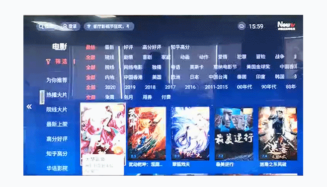当用户按下遥控器的方向键时,焦点会向着我们交互设计师希望它去的地方移动。这样的视觉引导,适用于界面初始状态。例如,当用户刚来到电影筛选页面,进行多组tab之间的切换时,每一次焦点始终落到第一个tab,以便用户能从第一个开始从左向右浏览,从而避免在众多的标签中迷失: