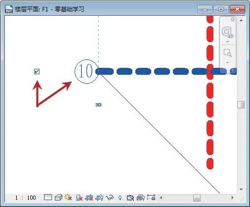 绘制水平轴线的方式与绘制垂直轴线的方式相同。将光标置于垂直轴线的一侧,如图所示,指定该点为起点。