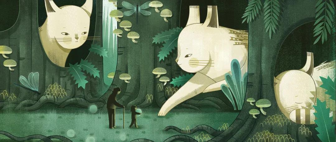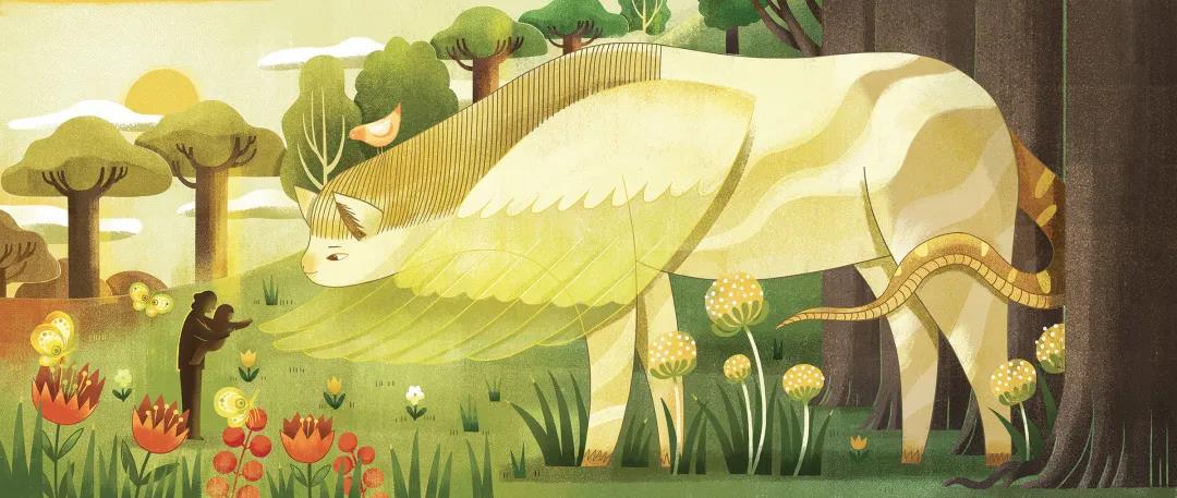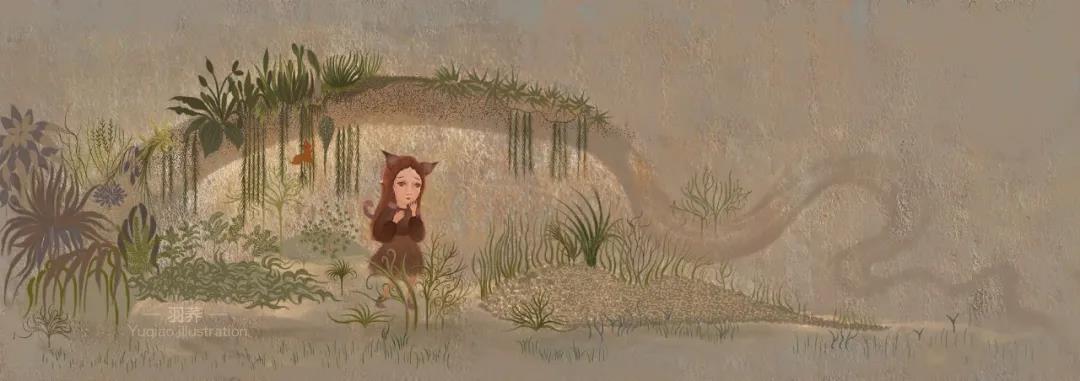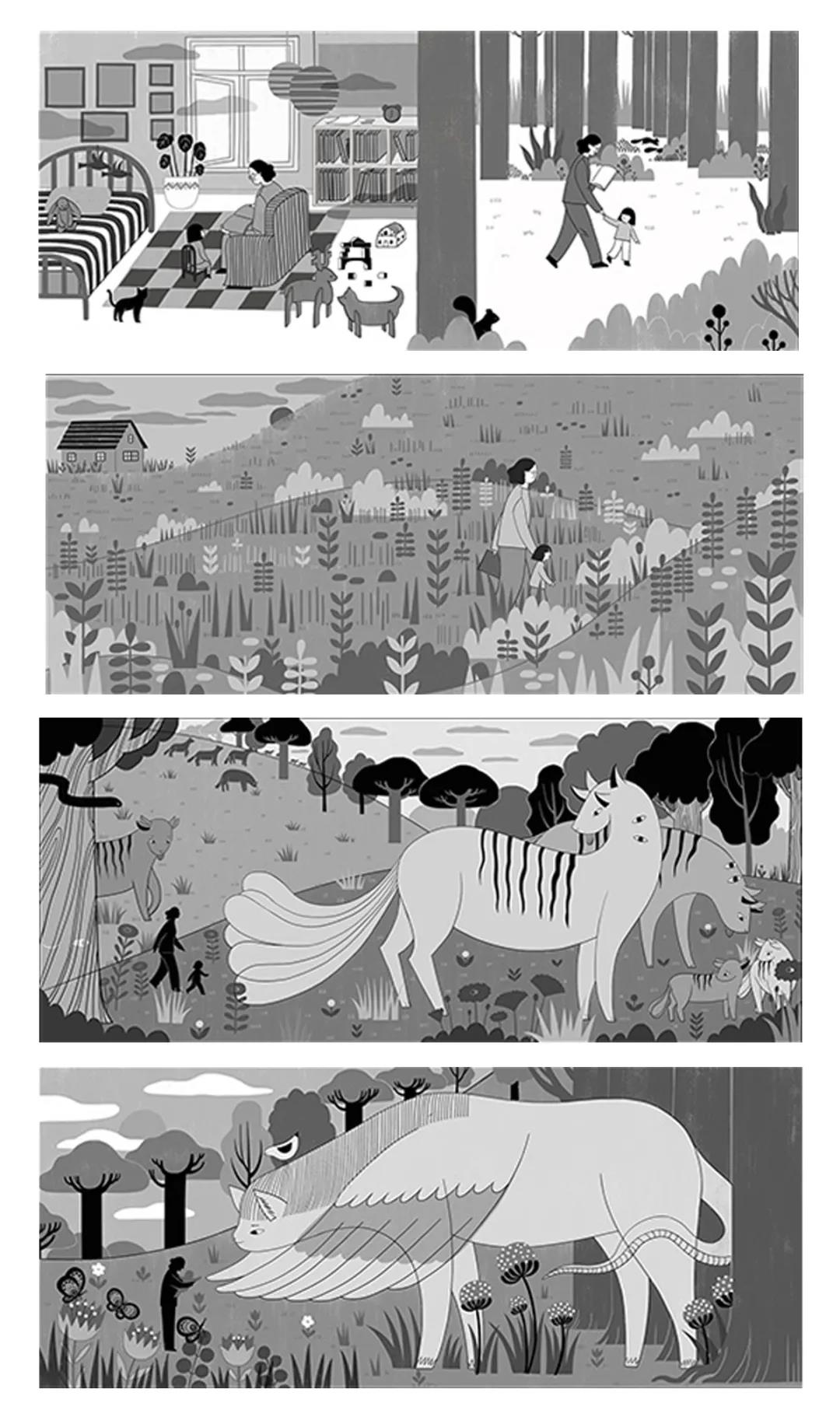 Hannah:《行走》是一套十四页的原创插图书。故事讲述了一个小女孩和她的监护人,她们走到旷野,走进深林,走向一个想象的世界里并邂逅了各种神奇生物的故事。这些画面其实更像一个一镜到底的镜头,带着观者从一旁静静地跟着两个主人公一起观察,一同冒险,一起行走着,视角从故事的开始到结束一直都没有变过。对我来说这是 一个关于成长、生命的循环、和勇气的故事,同时也是我在这个阶段想表达的一些情感。获奖的作品是其中的六张,完整的故事在我的个人网站可以看到:)