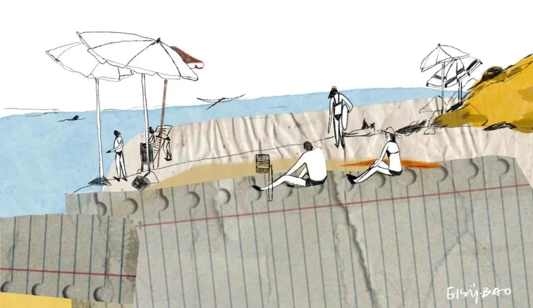 包壹栗:这一组插画展现了不同的人群在不同的场景悠闲自在的样子,我运用数字绘画结合电子拼贴的手法,将现实与画面结合。这一尝试对我来说也是一大突破,拼贴素材的选择和放置都是需要好好琢磨的。
