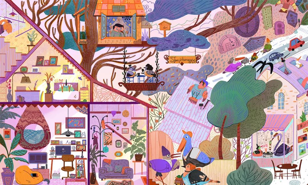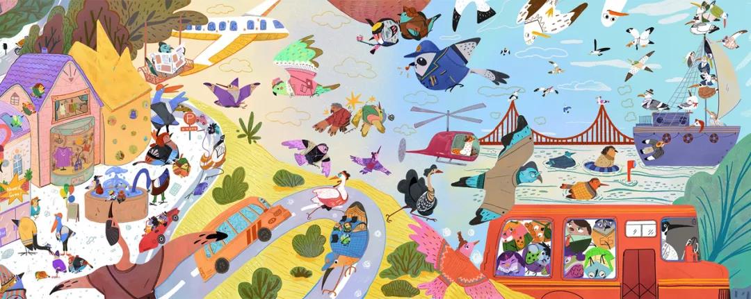 佳镭:这个是我毕设 鸟类风琴书的第一段, 想要描绘出 居民全都是鸟类的城镇中从早到晚发生的故事。创作目的主要是想锻炼自己画大幅作品和设计人物的能力。