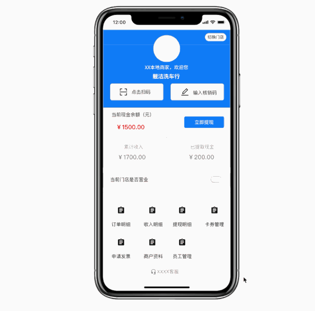 洗车在养车过程中是一个高频需求,在信息化时代,商家希望通过网上下单,实地核销的方式,立体展示出自己的收入、订单明细、提现,以及自己发放一些优惠券。