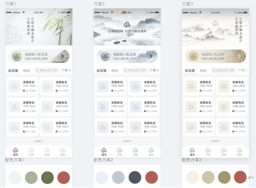 ps:祭祀在国人心中与清明相关系数高,清明直接联想到绿色,可以提高用户的感知度。最后定下第一版配色。风格基调主要是较为现代和较为清素的感觉。