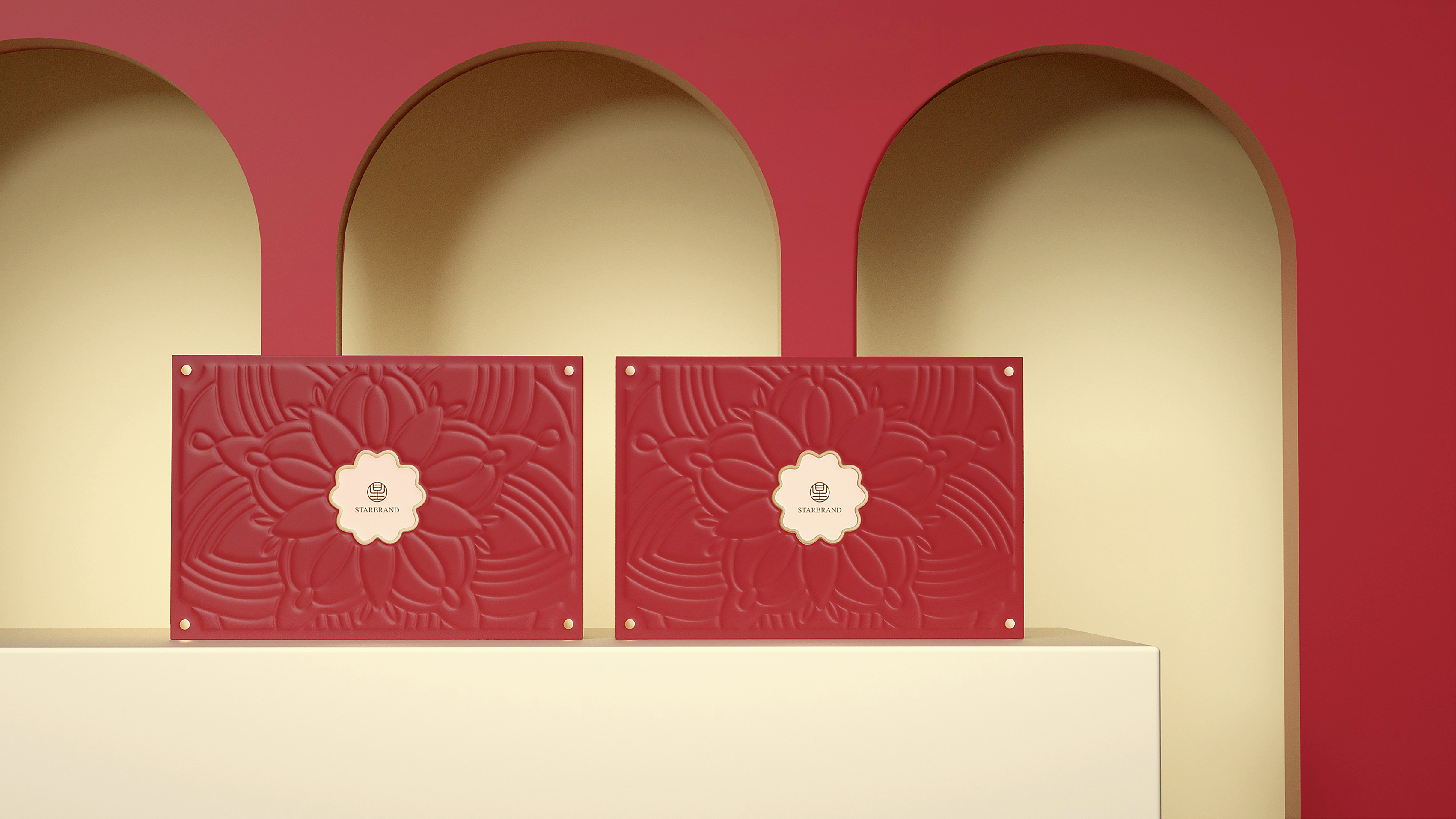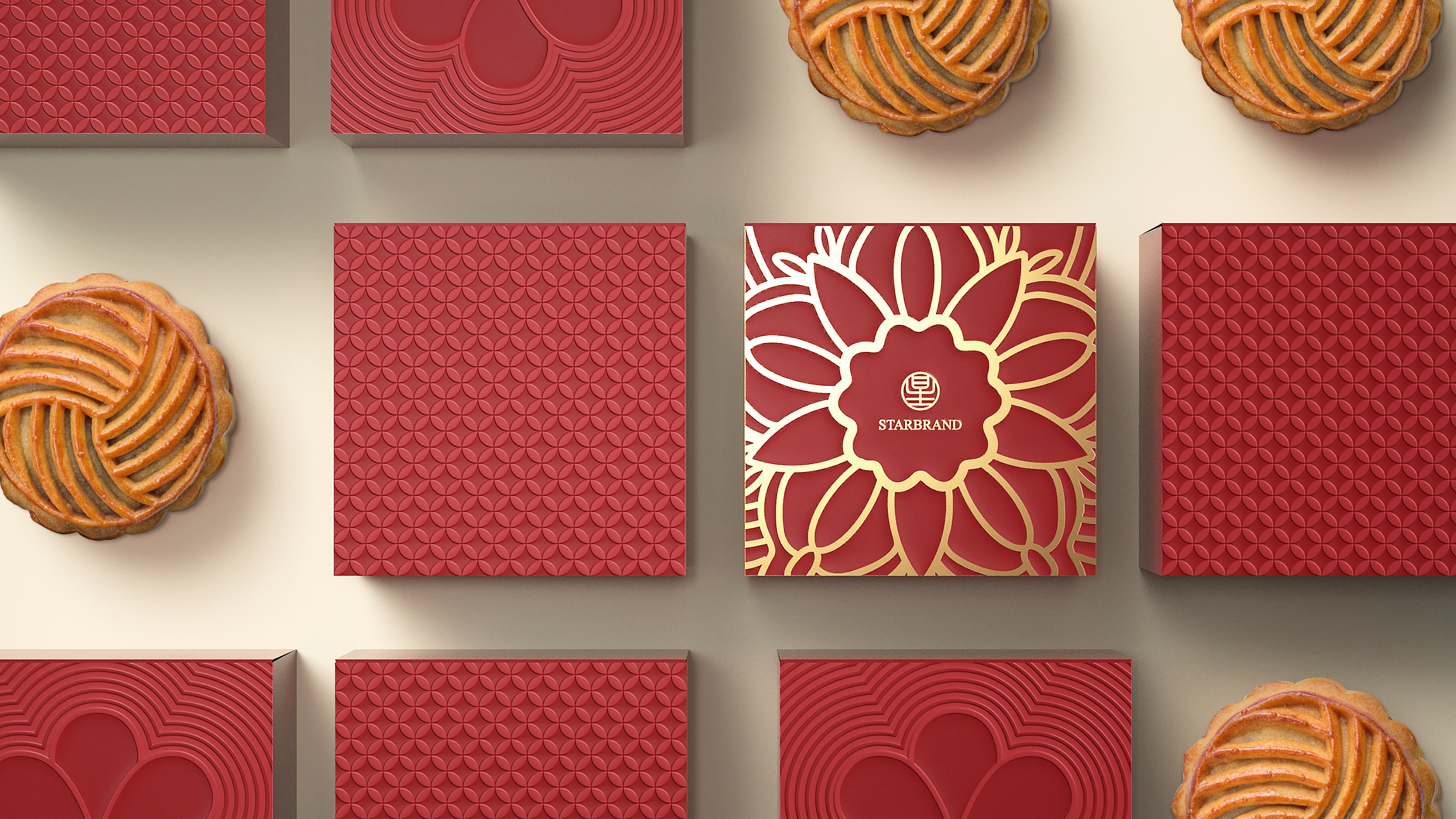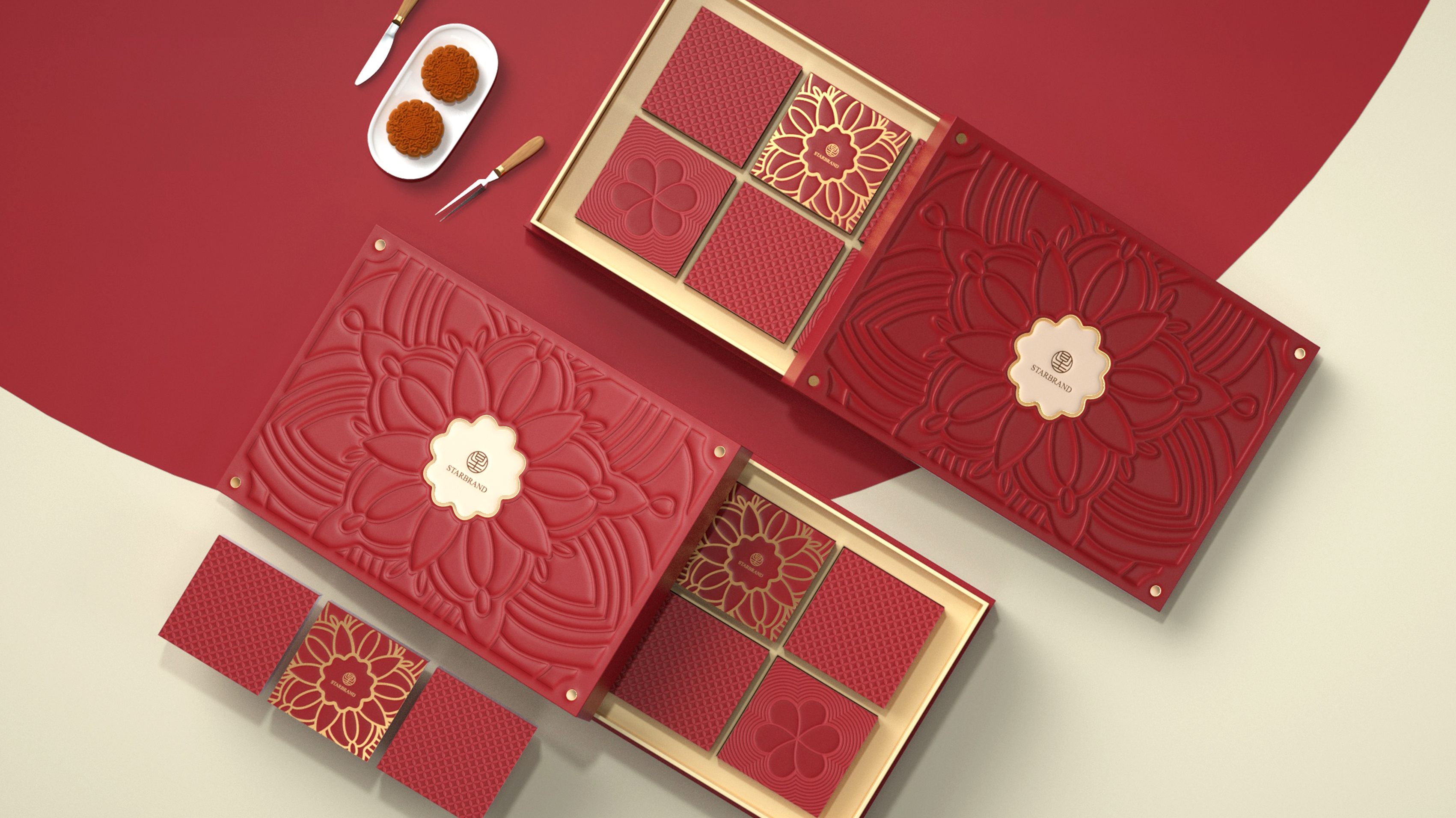 红色主题月饼礼盒包装设计,典雅商务,Ai源文件中可轻松替换LOGO。