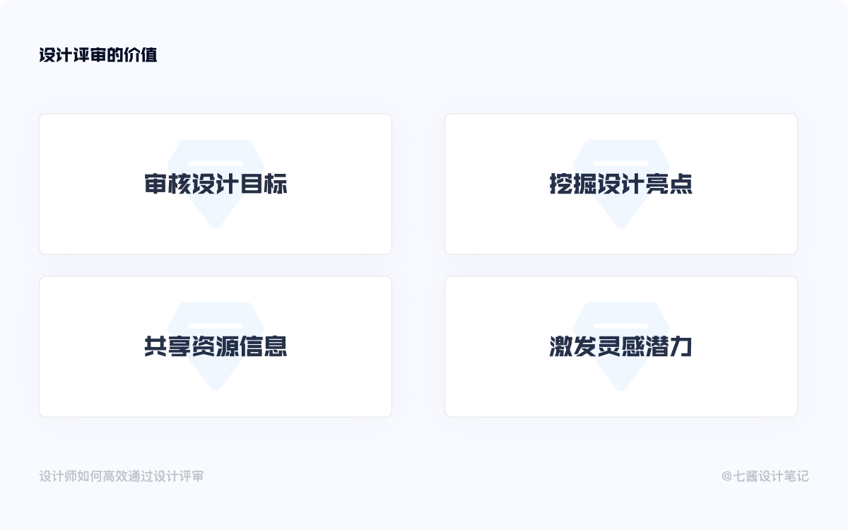 总的来说设计评审的价值可以有四方面:审核设计目标、挖掘设计亮点、共享资源信息、激发灵感潜力。