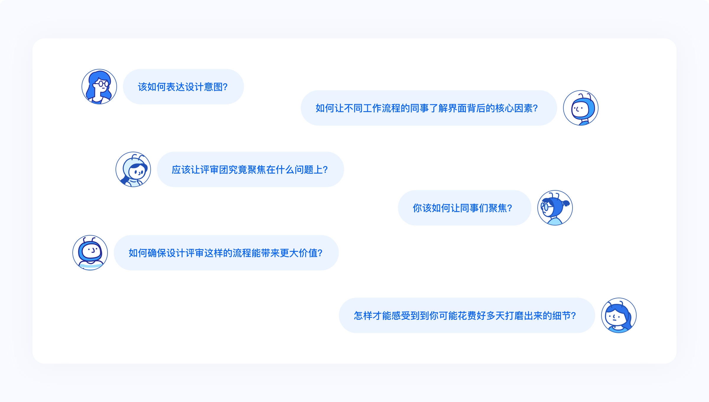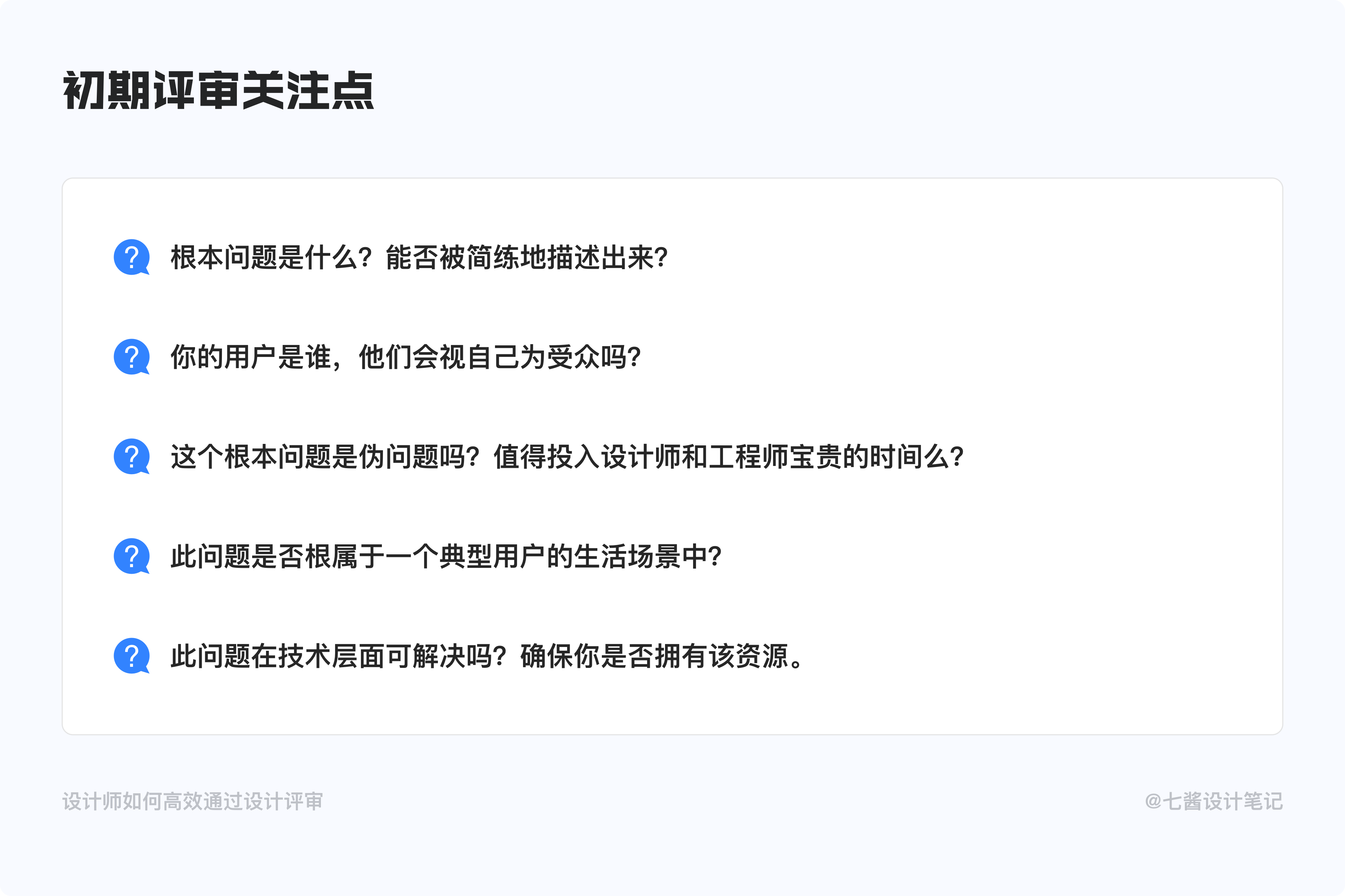在每次设计评审前建立清晰的原则-而不是“规矩”-至关重要。与规矩不同,原则不是教条式和限制式的,而是帮助每个人对焦期望,并允许进行自由形式的讨论。