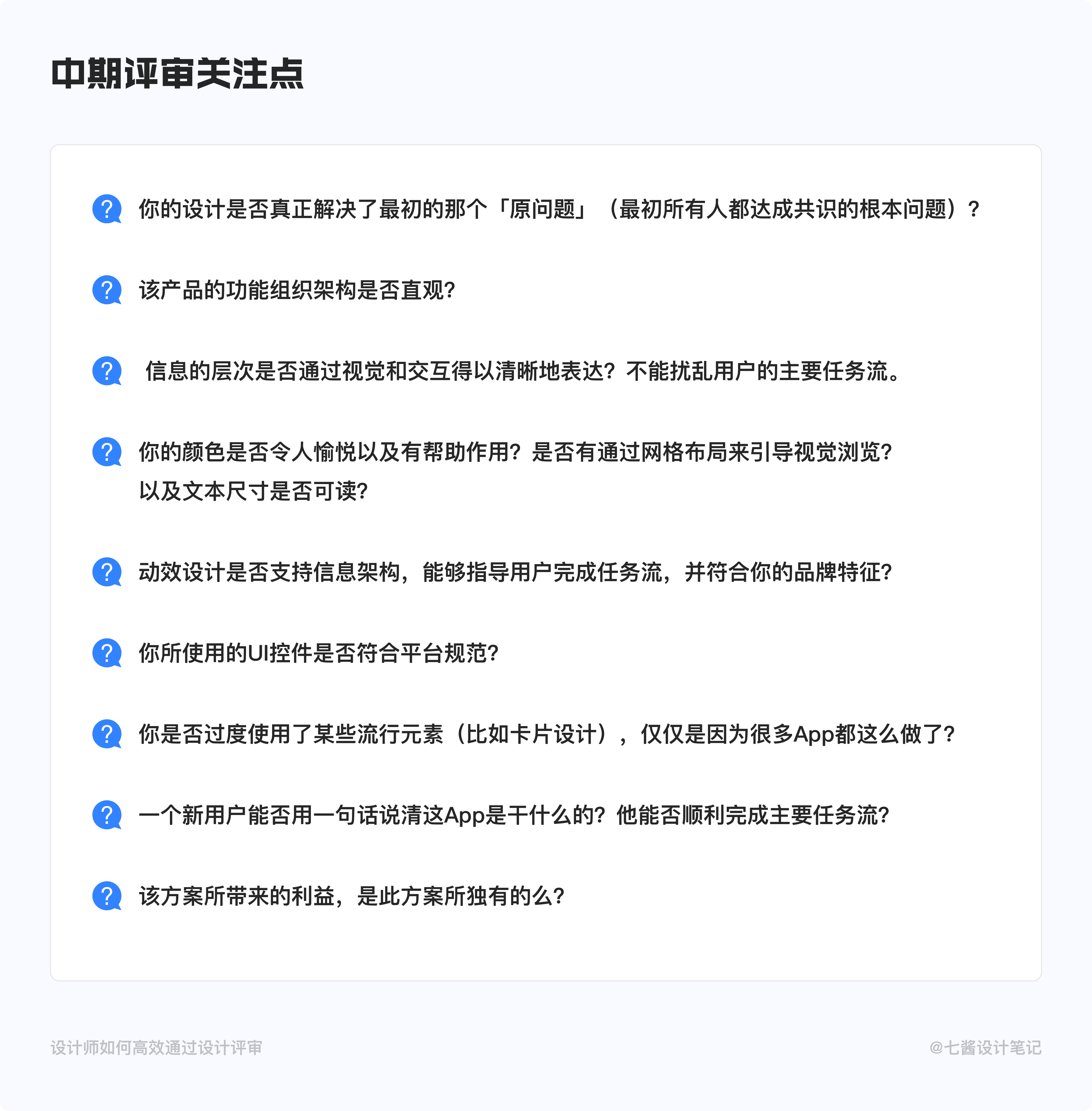 针对UI的设计评审应当在整个产品设计与研发过程中开展,或者至少以定期的方式,每周甚至每日开展。这么做可以让产品设计可控,尤其在设计需要进行多次迭代的敏捷或者精益产品流程中。在介绍完周期后,先明确下评审的原则。