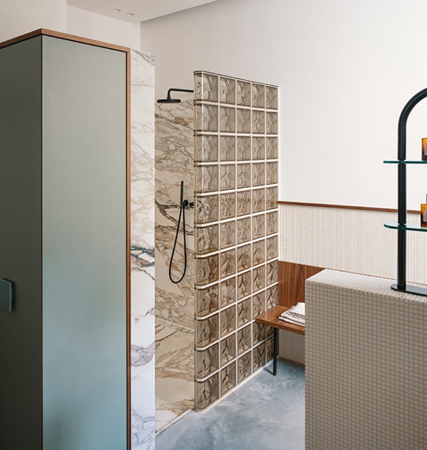 细致的手法呈现,同样出现在卫浴盥洗台与浅隔间,特意运用半透曲度玻璃做为淋浴区界线,实现低调隐现的美感,再辅搭带有自然圆弧、藤编素材家具,让优雅中也备具舒畅度。