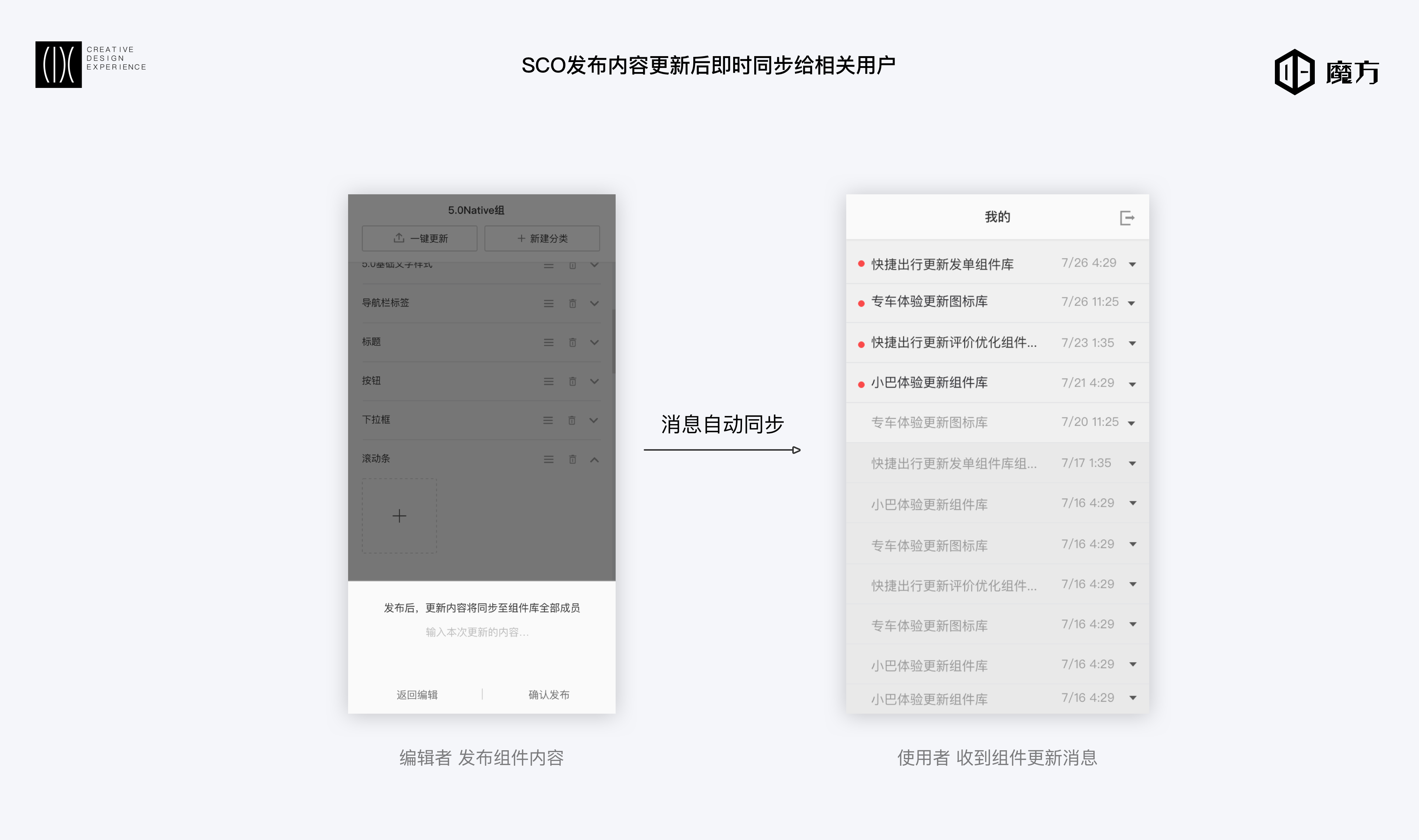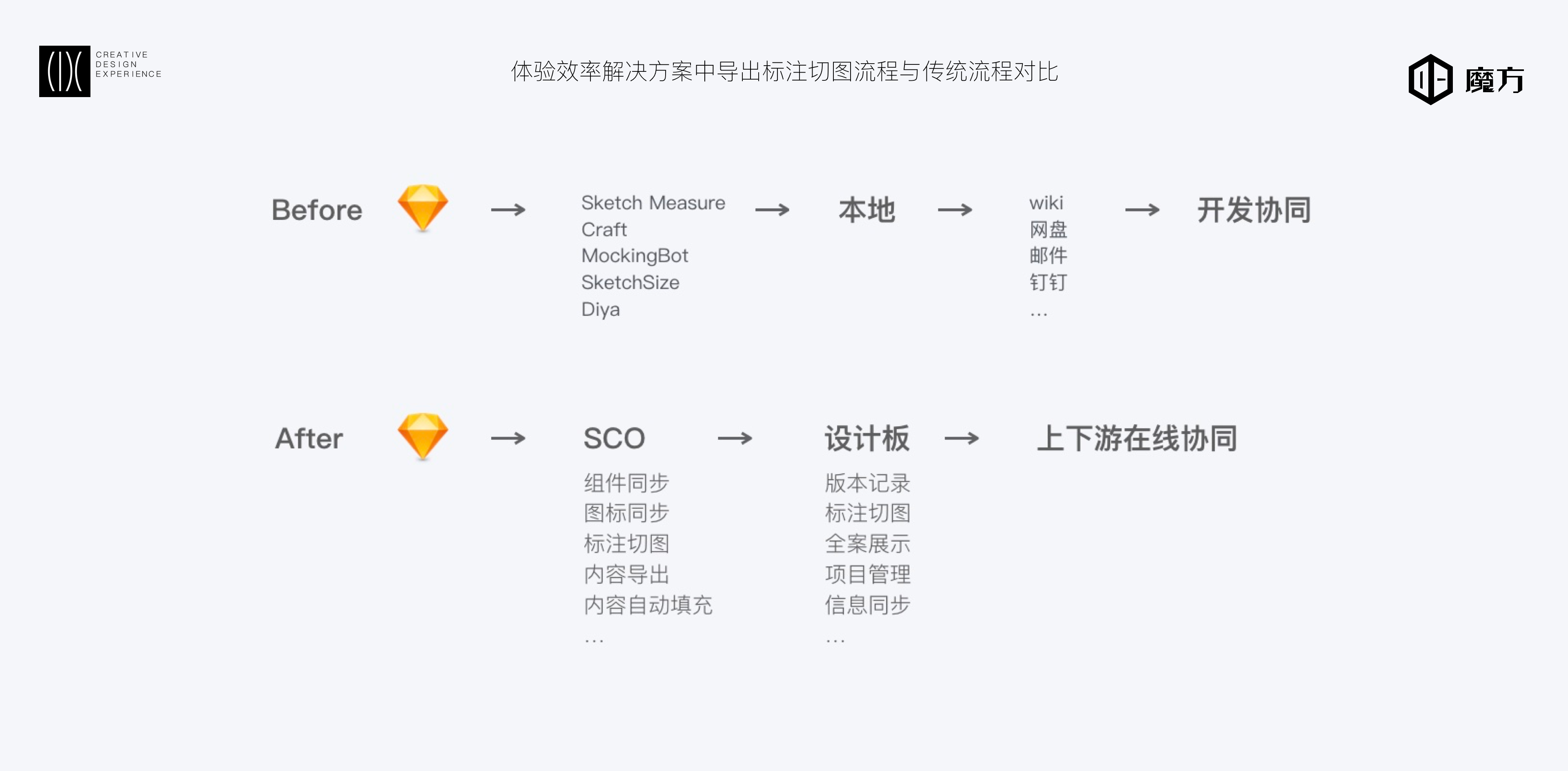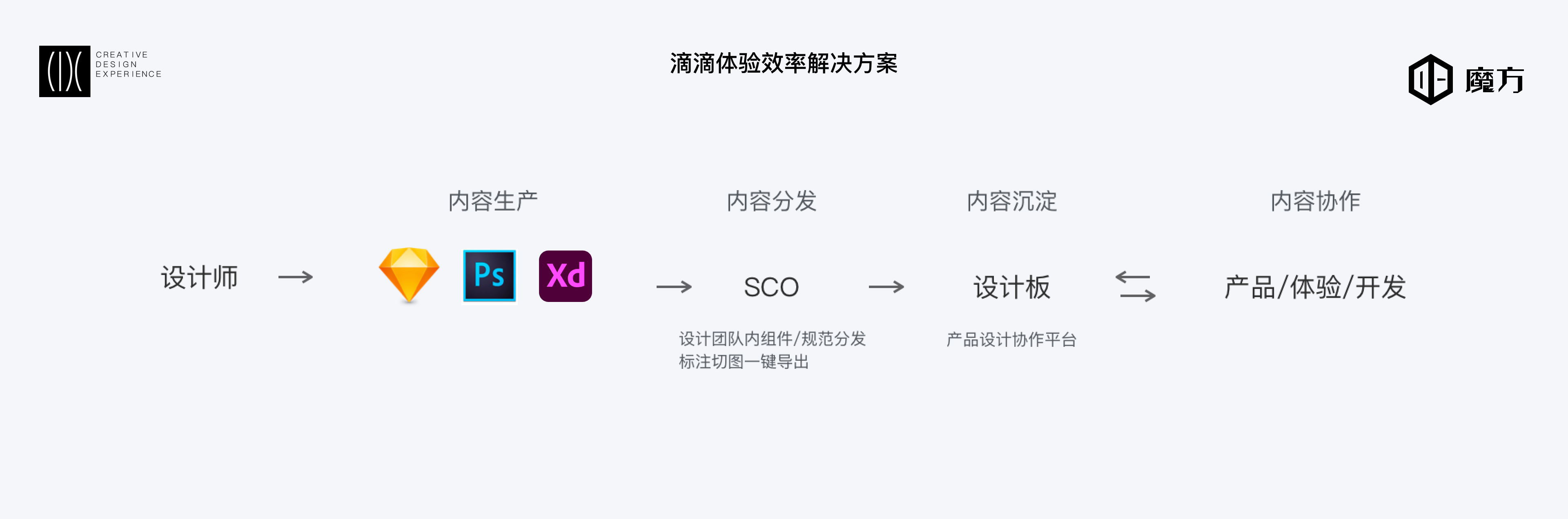 体验效率解决方案由魔方的两个产品的打通与整合组成,一个是“魔方·SCO(Share Cooperation Online)”,一款基于Sketch的内容分发和设计团队内的协同工具,负责内容的分发。另外一个是“魔方·设计板”,解决产品设计文档的沉淀与管理、设计上下游协作中遇到的挑战。