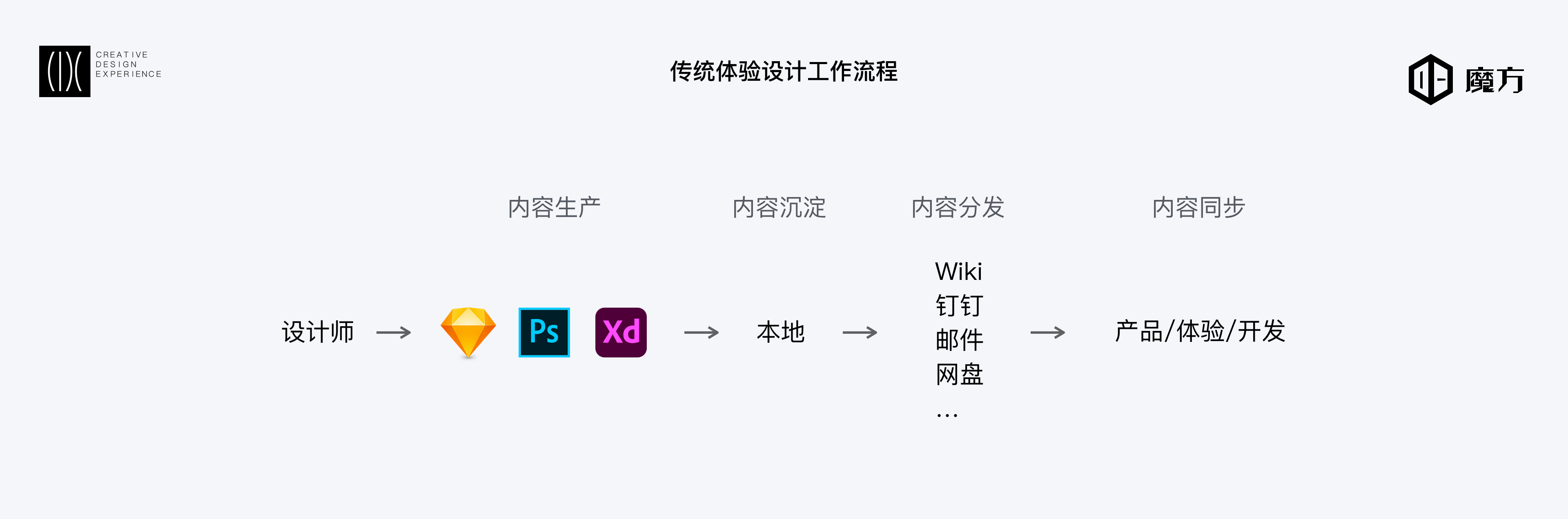 “魔方”体验效率解决方案围绕设计内容的流转,通过对工作流程中涉及到的能力整合及工具打通,使体验设计师注意力聚焦在内容上,提升工作效率,专注高价值产出。