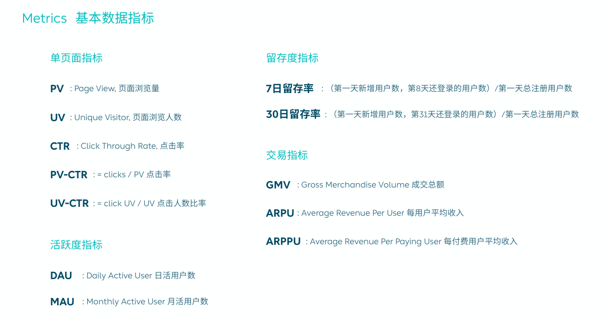 · 原始统计数据会随同你的用户基数增长而增加,需要转化为常态;比例、百分率或者每个用户的平均值更有用一些;