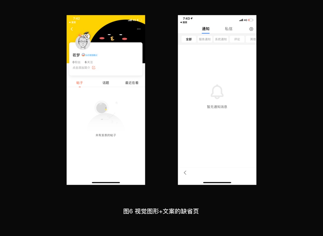 当缺省页给到用户时,通常省时省力的做法就是老老实实告诉用户当前的状态,最多配上一个具有通识性的灰色 icon。但是,秉持着以用户体验为己任的时代,我们其实可以把缺省内容表达得更加生动形象一些。在这里会加入一些情感化的表达,而不是仅仅只是做到准确的目标而已,比如加上活泼的插图故事,或者把文案写得更加拟人化、戏剧化一些。这些配图在让用户明白当前的状态的同时,往往也能引发用户会心一笑,从而弥补空白页面带来的失落感甚至可以带给用户一些正面的情感。如下图:
