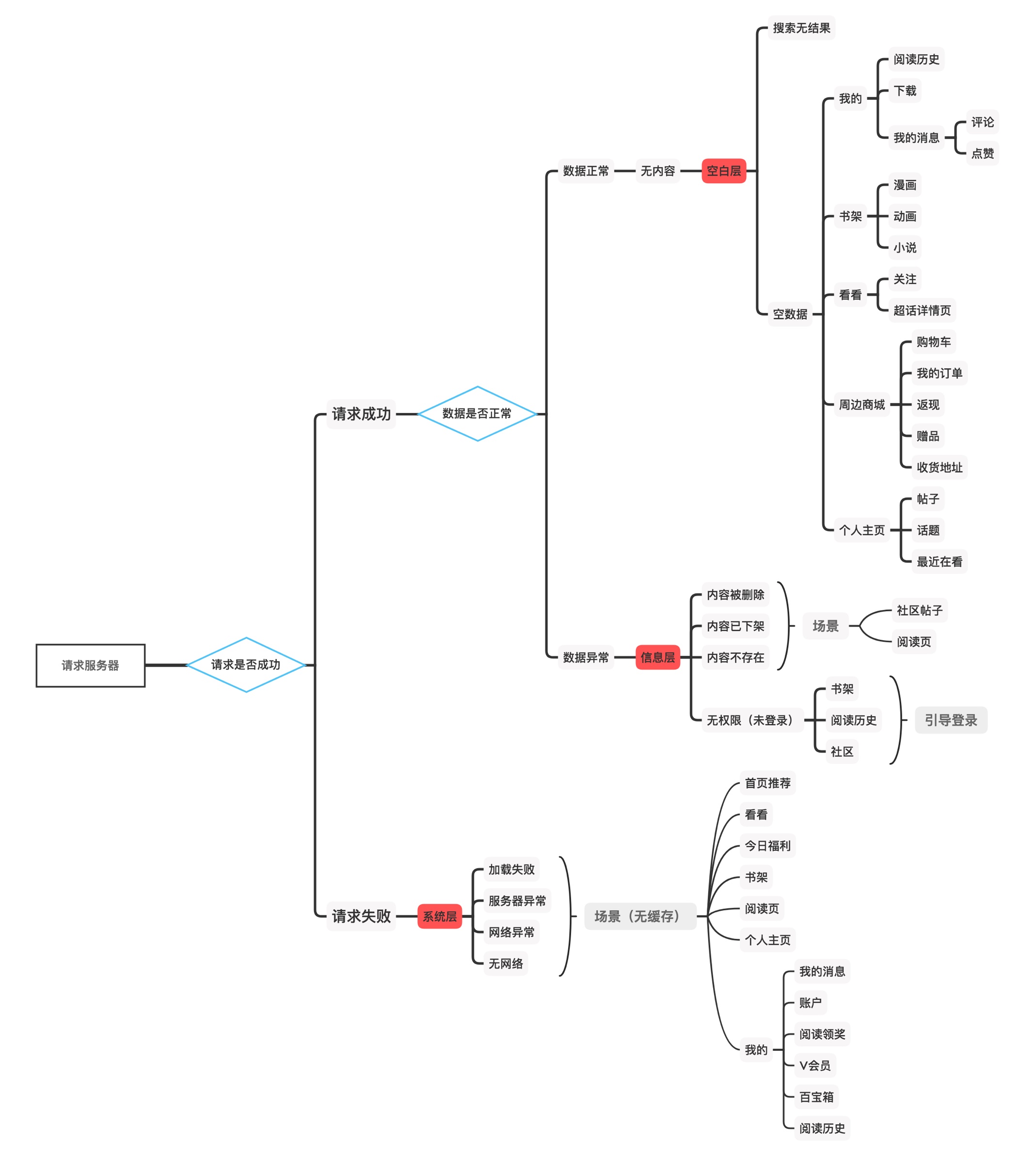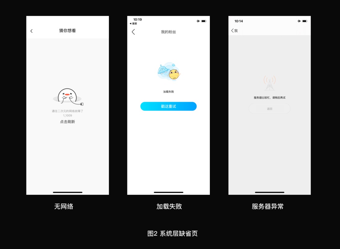 系统层:指当用户请求服务器时,返回提示请求提交失败,并检测到失败原因时呈现的页面;例如:加载失败、服务器异常、无网络等;页面一般会有重新请求的快捷按钮。文案上可做失败原因的细分描述,也可节约成本使用网络异常的统一文案。