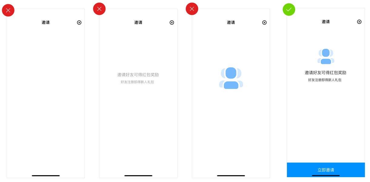 缺省页面设计不仔细,不能给用户带来良好的用户体验,可能会给用户带来麻烦,如下图所示:利基直播平台的新邀请页面在没有邀请记录的状态下没有任何有效的反馈信息,用户无法确切知道是网络问题还是账户同步错误,或者根本没有邀请。正确的默认页面设计内容应该清晰地表达满足用户心理预期的视觉场景表达(图形);并使用易于理解的语法来恰当地表达当前的异常状态(标题),甚至指导用户解决问题。