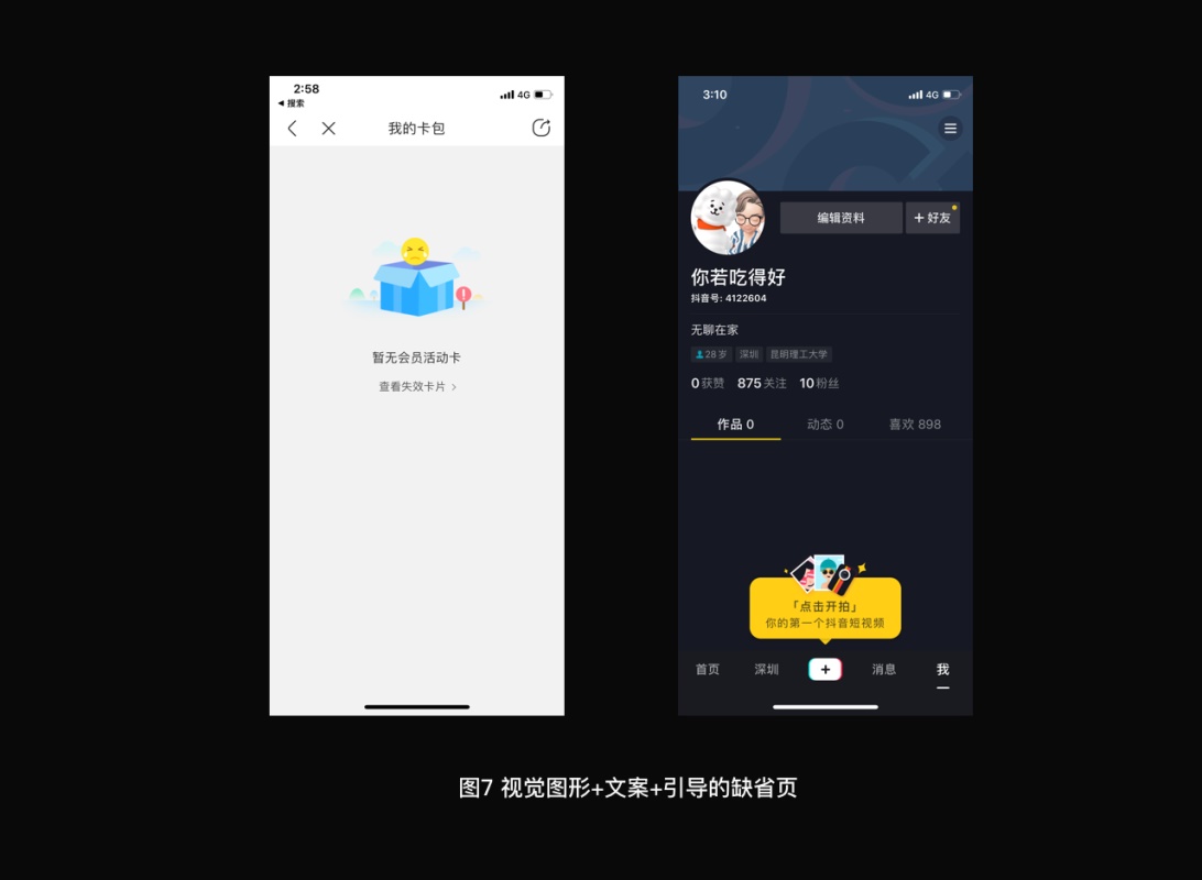 这种默认设计形式通常应用于需要用户指导操作以实现业务目标的默认场景。在视觉模式复制的基础上,增加了引导模块,主要用于避免用户在数据边界状态下无法达到操作目的的跳出率。引导模块的内容包括:相似属性内容、相似行为目标按钮或解决缺省状态操作按钮、添加引导、用户执行某一行为或感知某一信息,对功能教学和提高使用频率有重要作用。引导模块的形式日新月异,逐渐成为引导新用户业务的功能,不仅限于页面平铺,还可以制作成固定的气泡微动效果,例如,发布颤音的默认页面。