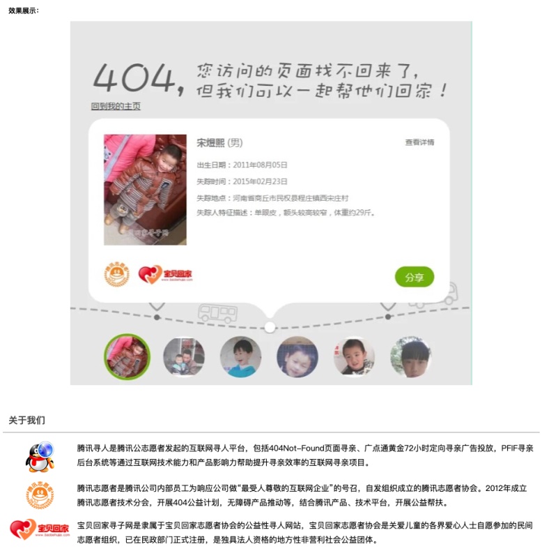 通常缺省页的引导模块都着眼于解决当前任务。如果碰到没有解决方案的情况(例如:404,服务器崩溃等)可以提供给用户具有情感共情的新任务,让他们暂时忘记无法达到目标的挫败感,又有体谅的情怀。帮助建立正向积极的品牌价值观。例如:访问腾讯网时访问失败的时候,网页除了显示 404 状态之外,还会显示腾讯「宝贝回家」的公益寻人计划。将缺省页与公益内容相结合,不仅改善到用户缺省状态。也贯彻腾讯价值观「用户为本,科技向善」的输出。一个好的缺省页也可以承担社会责任,让公益传播到每个角落。