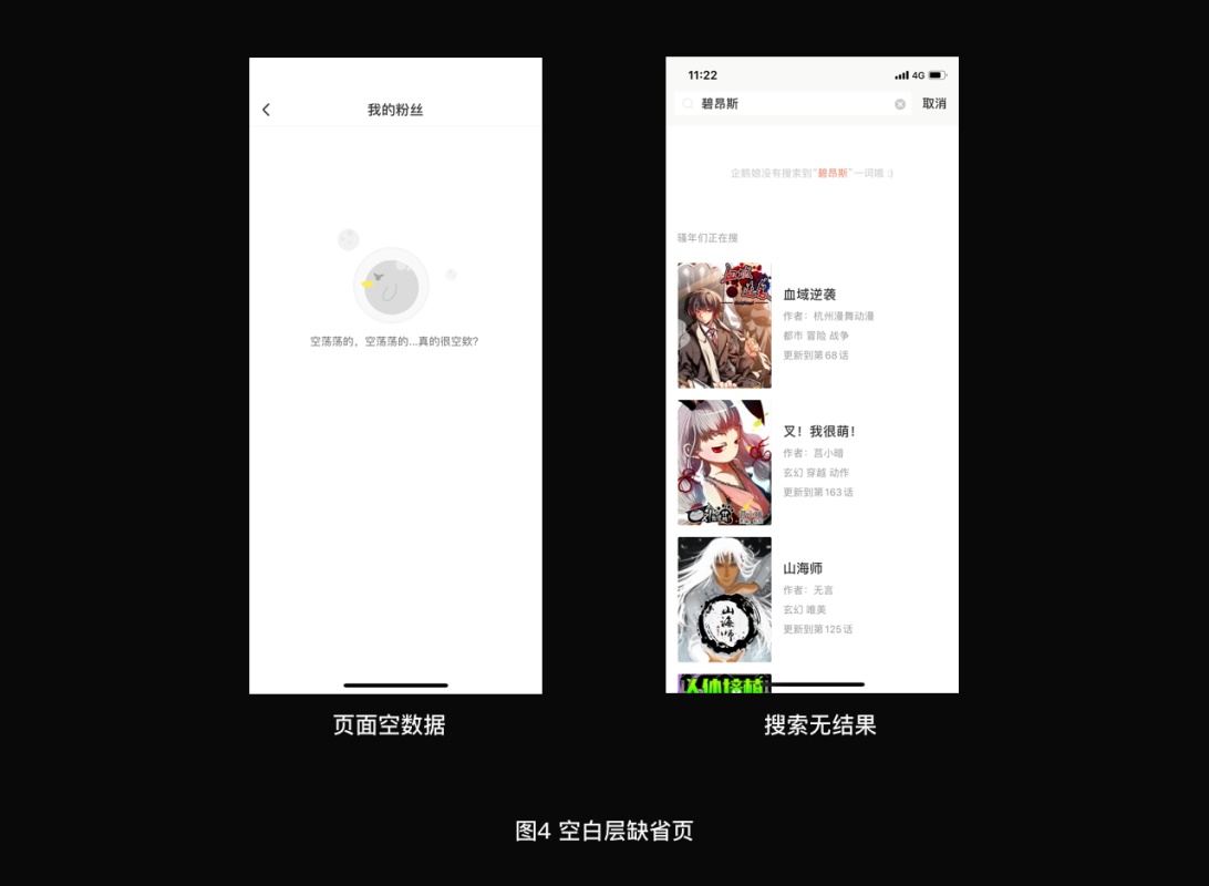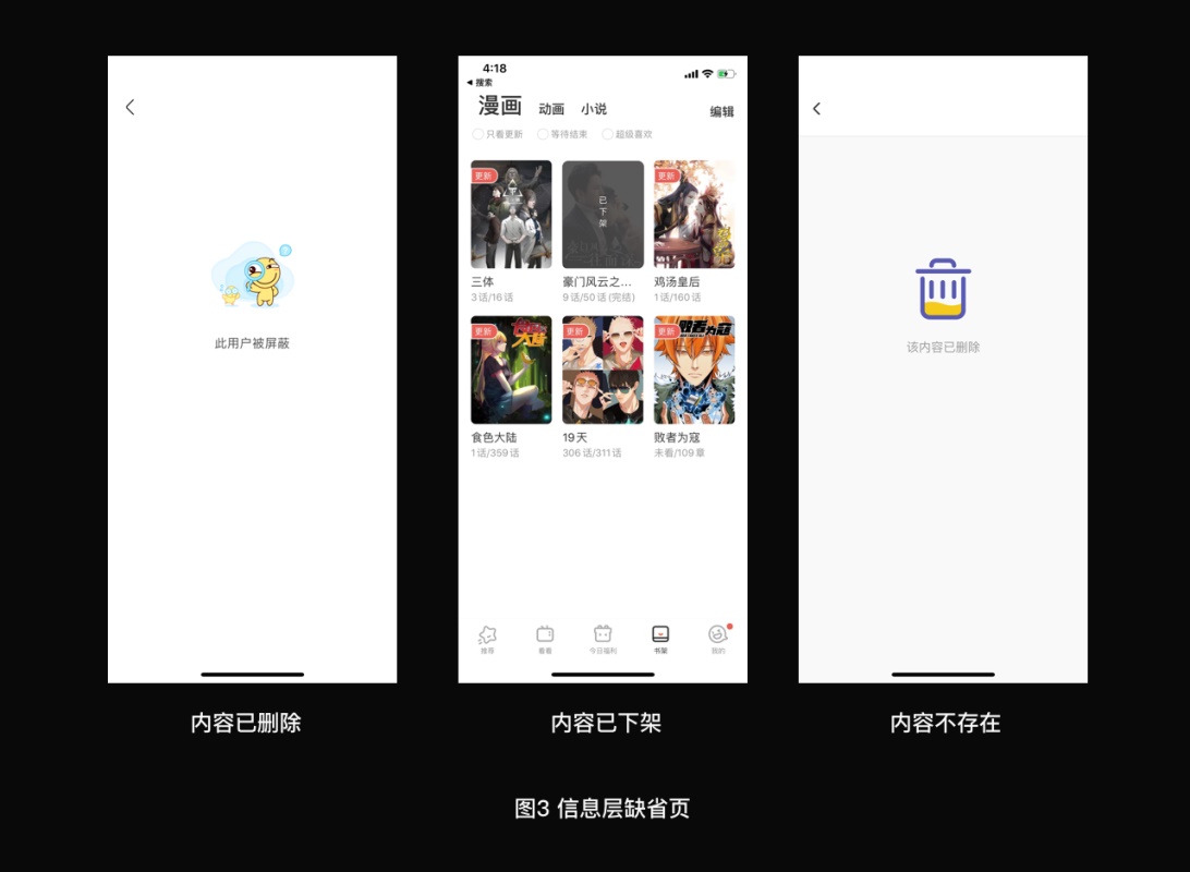 信息层:请求服务器数据成功,但返回的数据异常的页面;例如:内容已删除、内容已下架、内容不存在;文案内容以提示数据类型的缺失为主。显示形式除了常有的全屏缺省图,还会出现在数据列表下单一内容缺失的缺省模块化的情况,例如:单一作品在书架上显示已下架。