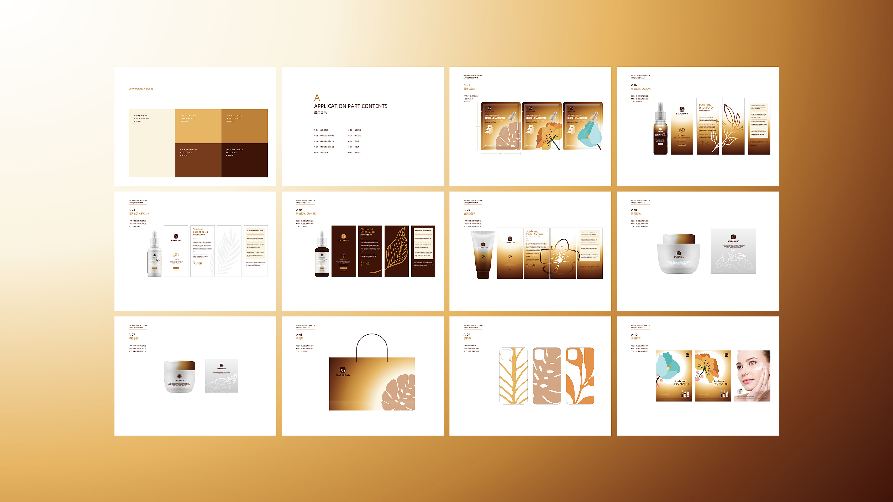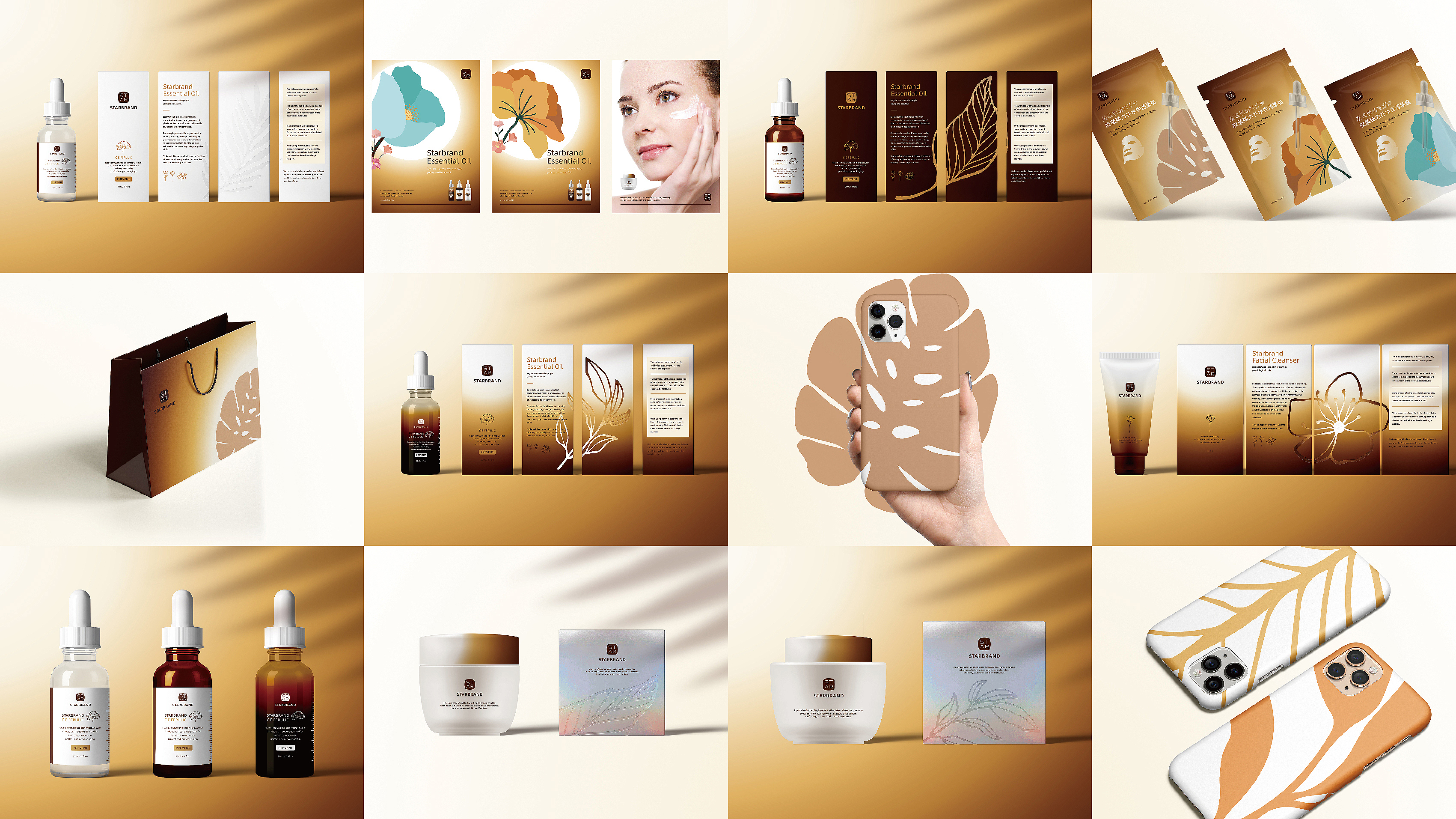 一组奢华风格的护肤品包装设计模板,包括品牌调性、精油包装、面膜包装、手机壳设计、手提袋设计。