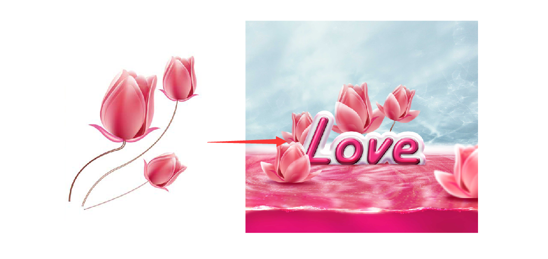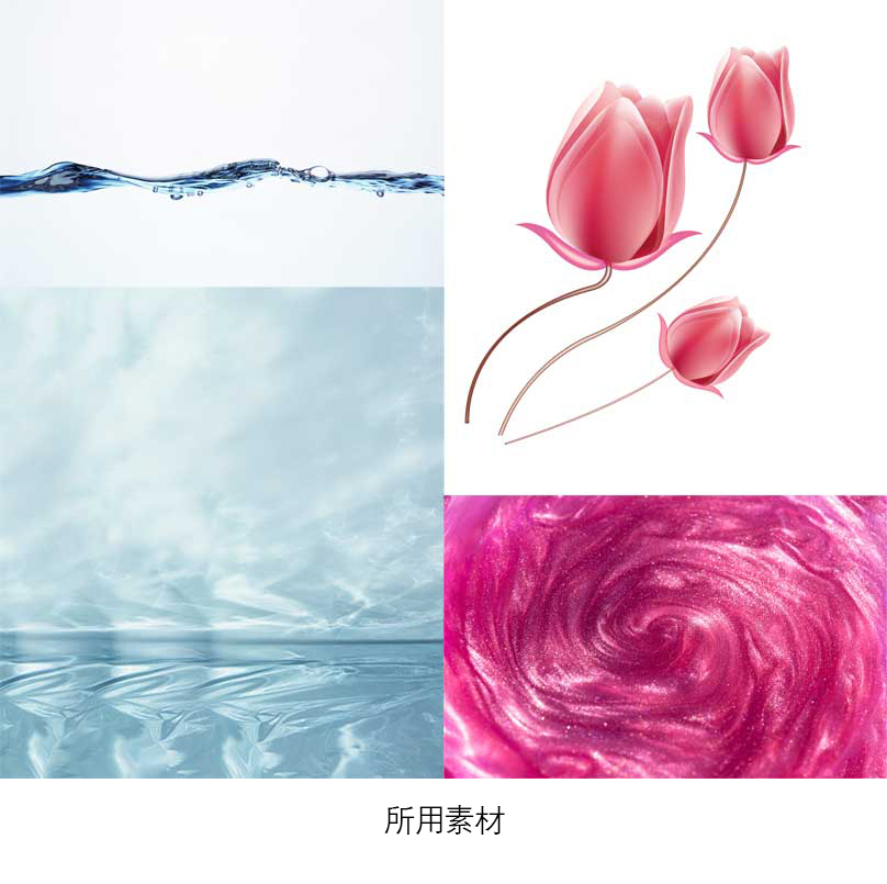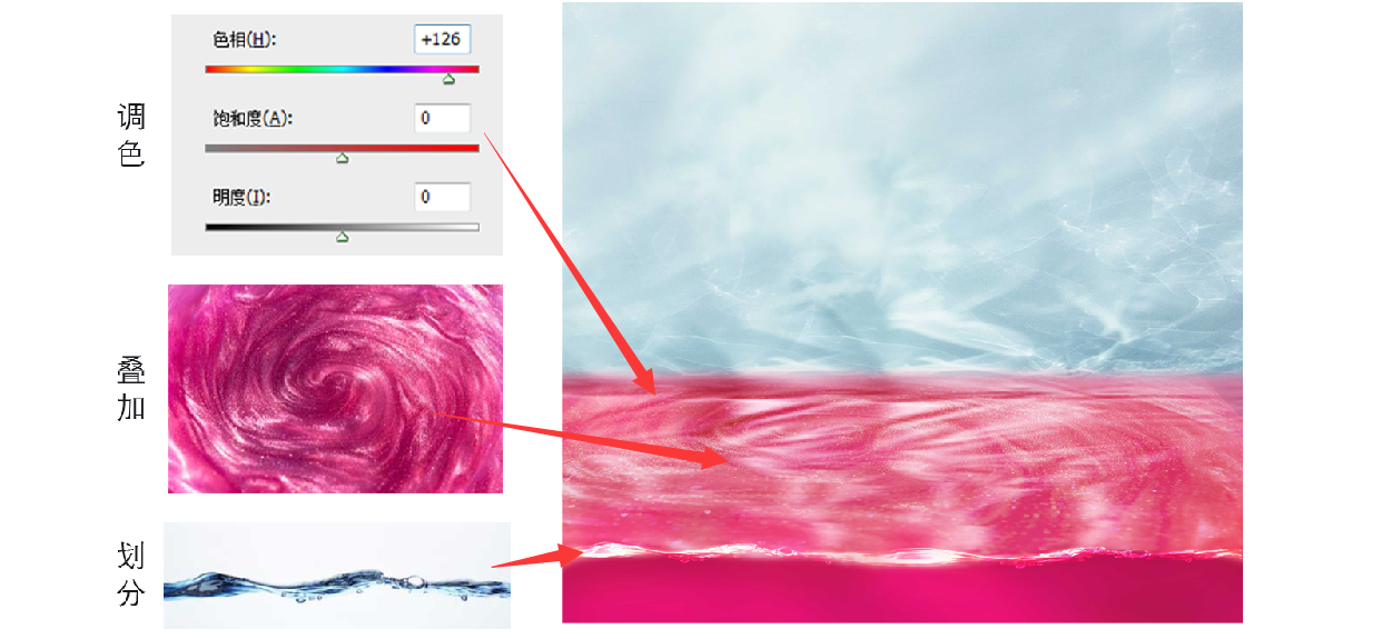 ------------把水面调成粉色,叠加素材,添加一个水平面的线-----------