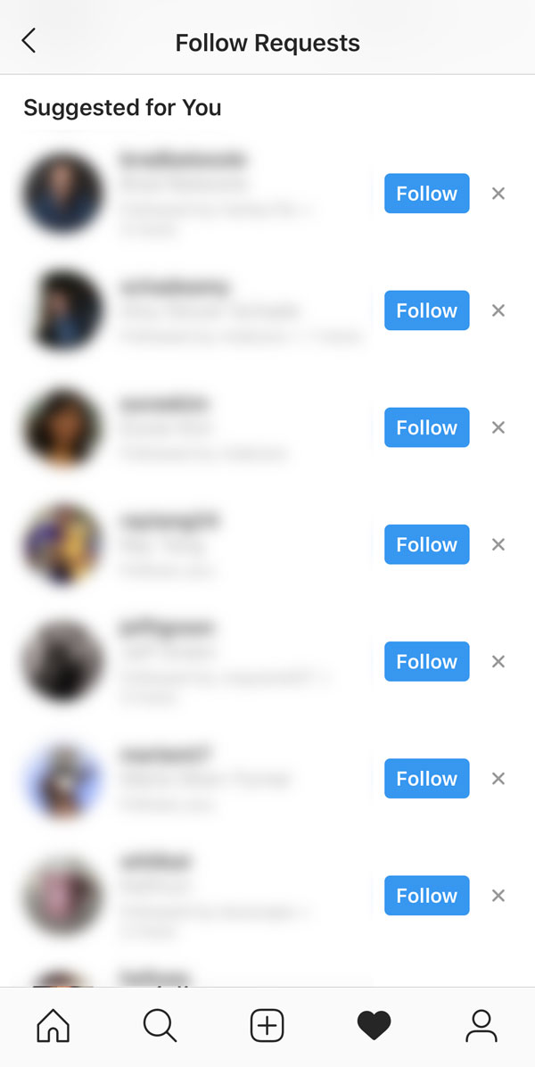 iOS版的Instagram: 关注按钮右侧的x拒绝按钮太小,这些相反的操作之间的间距不足以弥补它们的小尺寸。