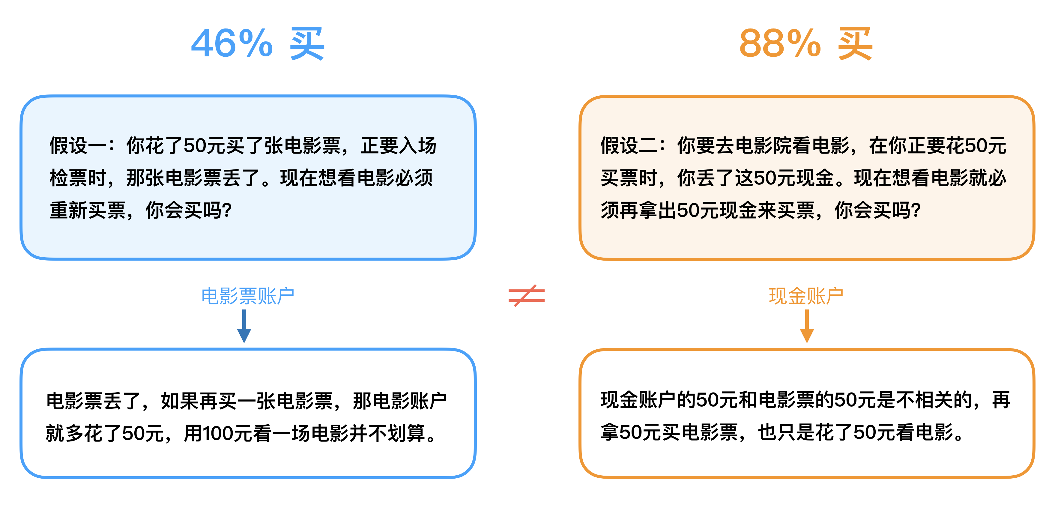 丢50块钱和丢50块的电影票是对等的,可是统计结果有如此大的差距都是因为有心理账户的存在。