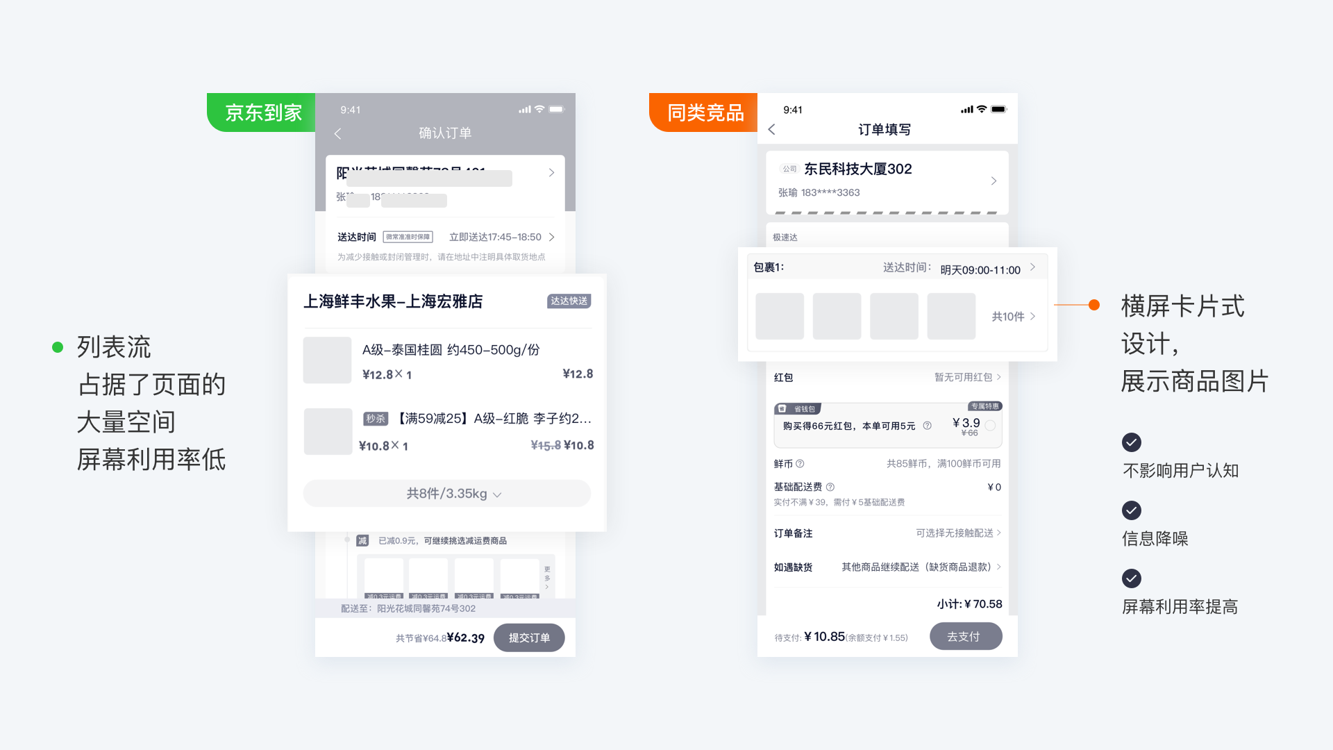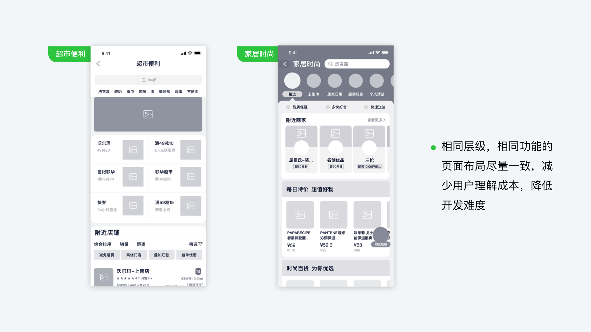 如上图所示,在首页金刚区中超市便利、买菜、水果、鲜花等都属于同一层级下的不同商品类别,在功能布局上应该保持一致性,但家居时尚板块在展现类似的界面内容时,布局却和其他几类有很大差别,这里会造成用户操作理解成本的增加,降低用户体验。