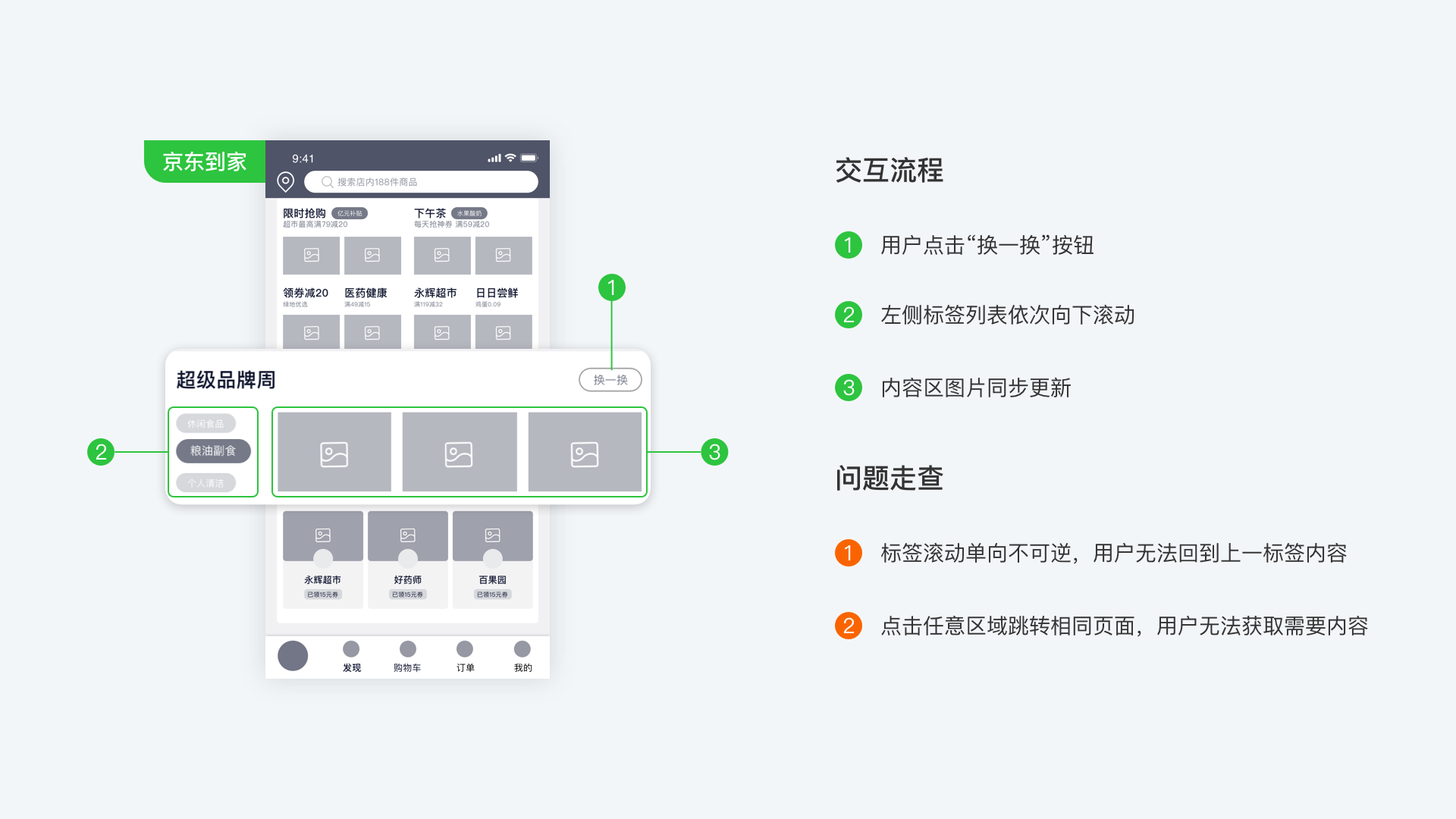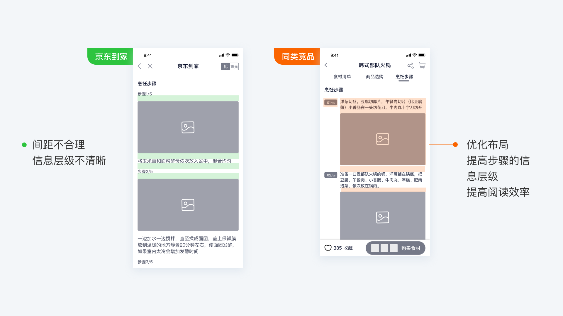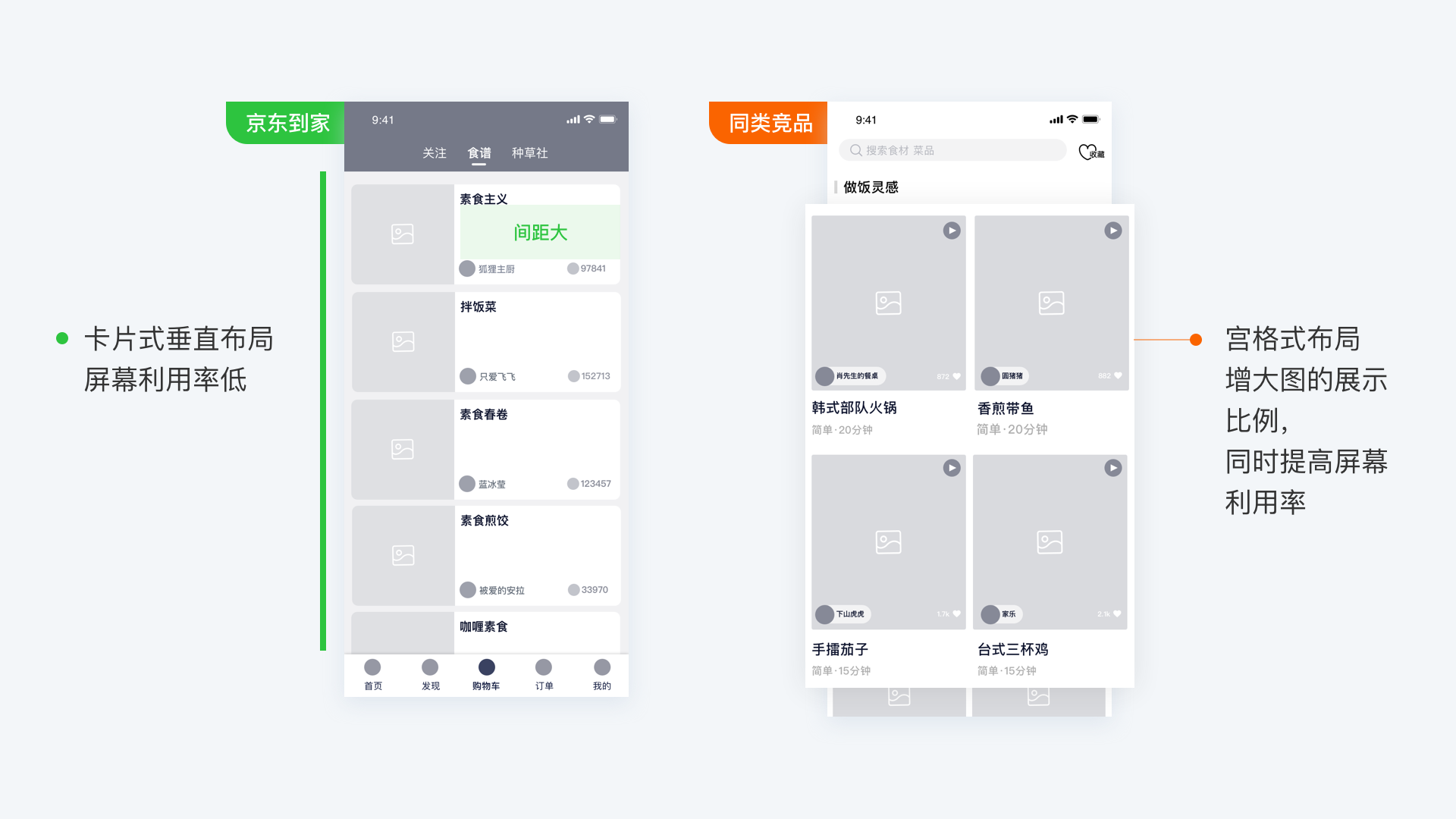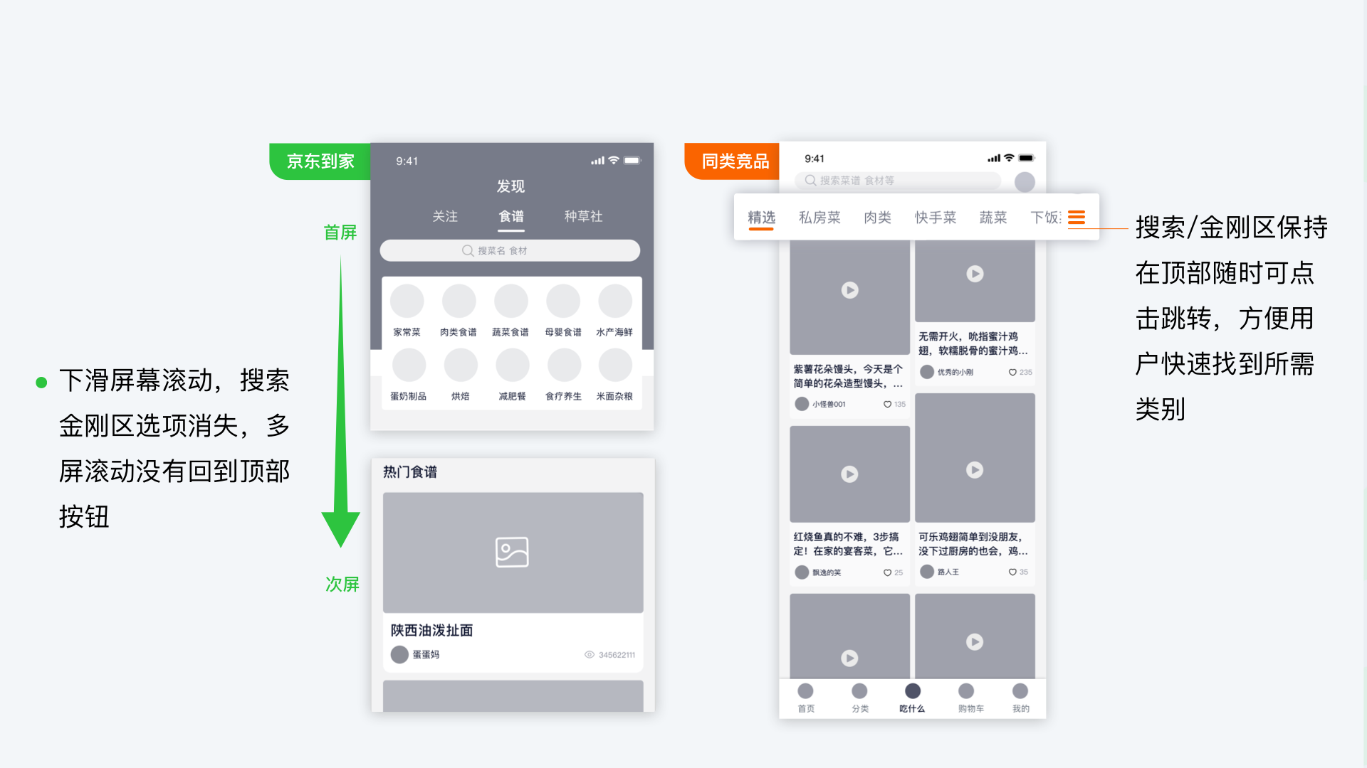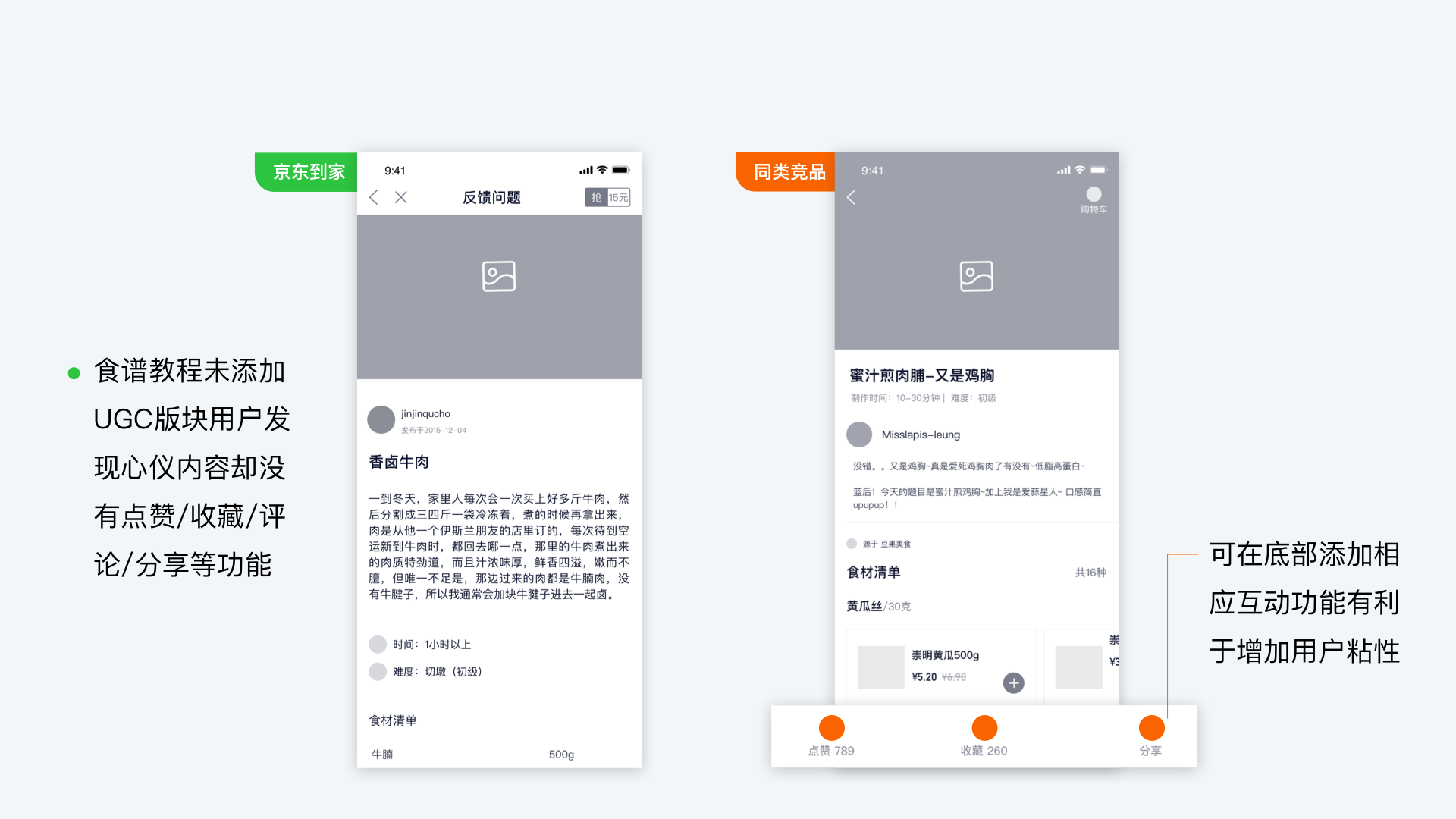 而京东到家的这一页面只有菜谱,而没有提供用户释放好奇心,释放情绪的出口,也就是说没有给最终下单创建一个入口。这就意味着交易转化的流失。